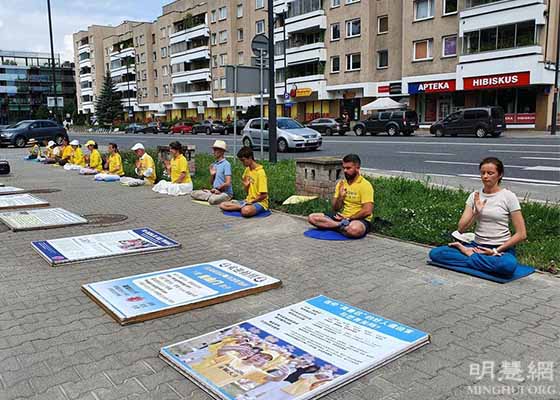 二零二一年七月十八日,波兰法轮功学员在华沙中使馆前静坐,抗议中共对法轮功持续二十二年的残酷迫害。