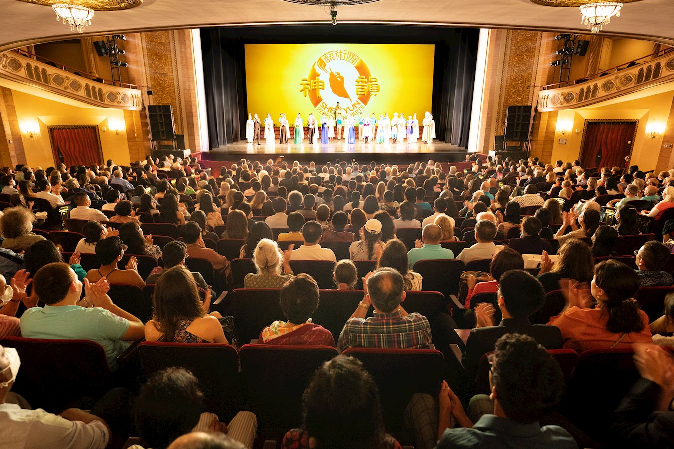 ![]() 图1:神韵纽约艺术团二零二一年七月二十五日在康州斯坦福派雷斯剧院(The Palace Theatre)演出。演员在雷动掌声中谢幕。 |