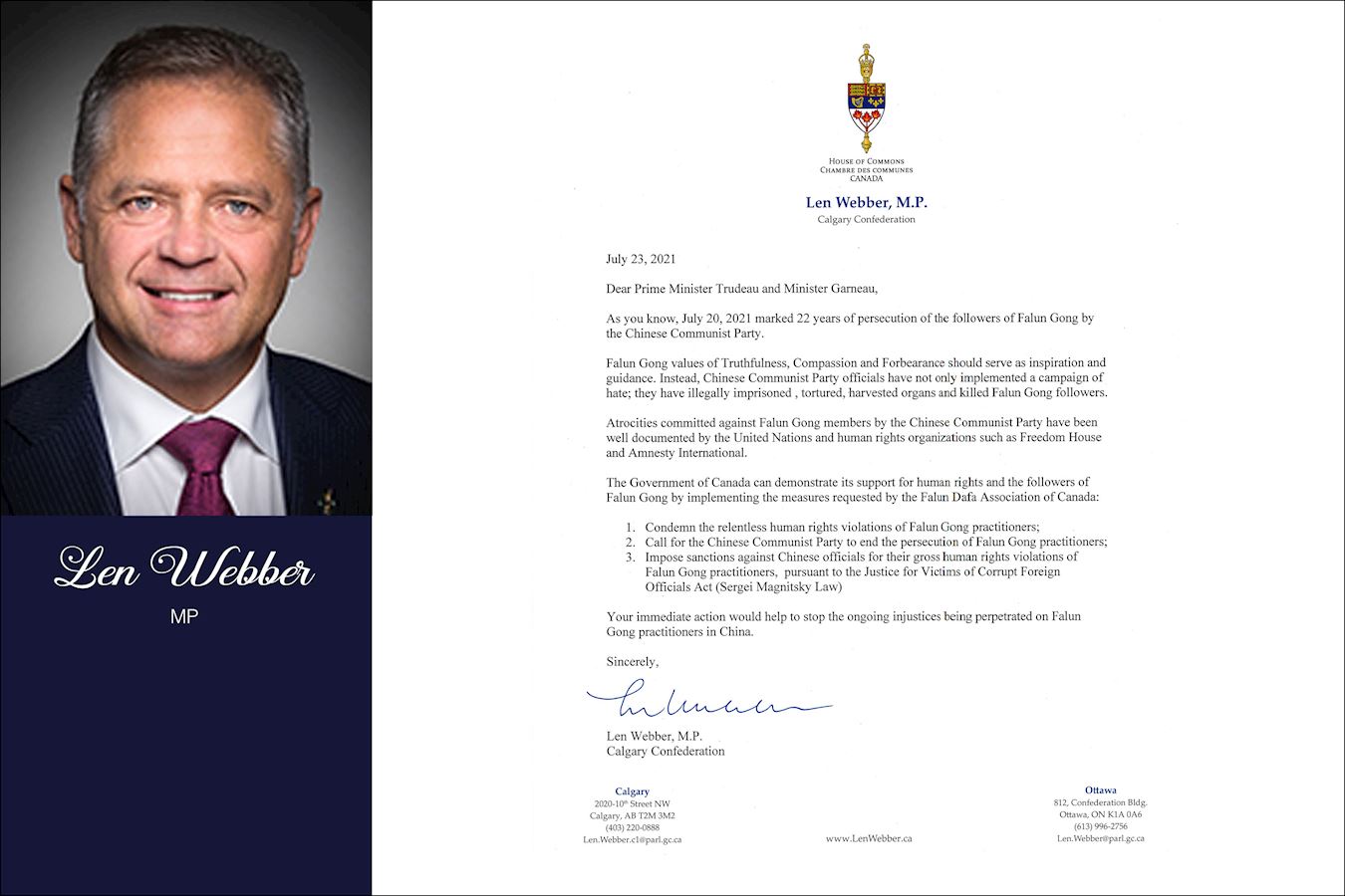 他说:“二十二年来,法轮功学员从未停止对中共专制政权的和平抗议。无论你走到世界各地,你都能看见他们。在中共进行残酷的种族灭绝时,他们继续遵循法轮大法的真、善、忍理念,令人佩服。”