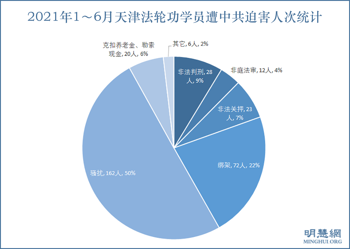 【明慧网二零二一年七月三日】(明慧网通讯员天津报道)据明慧网2021年1~6月份报道统计,天津市法轮功学员累计受迫害312人次,其中28人被非法判刑;72人被绑架;12人被非法庭审;162人被骚扰;23人被非法关押;12人被无理克扣养老金、8人被勒索性罚款、押金,涉及金额104万7200余元。另有3人被“取保候审”、3人被绑架后去向不明、3人被骚扰后流离失所。