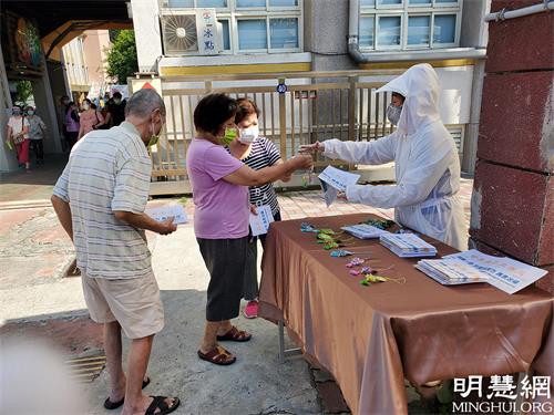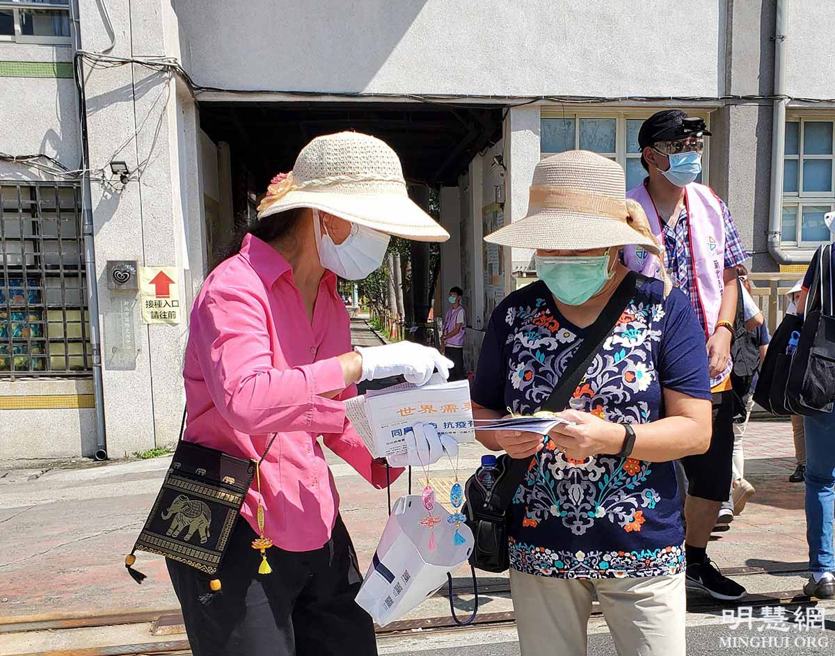 ![]() 图1~2:台湾法轮功学员在疫苗接种站向民众派发真相特刊,传播防疫良方——诚信念诵九字真言。 |