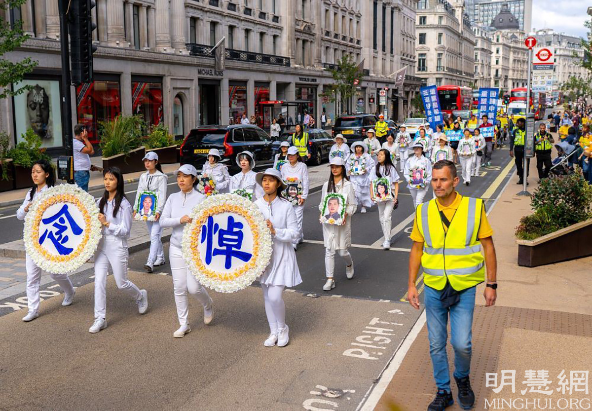 游行队伍于上午十一点十五分从伦敦中国大使馆对面开始,游行队伍包括法轮大法横幅、法轮功功法、大法书模、腰鼓队,反迫害横幅等方阵,浩浩荡荡的经过伦敦市中心最繁华的摄政街、中国城等地、鸽子广场、首相府所在地唐宁街,最终抵达议会广场。沿途吸引了很多人驻足观看,拍照录像,还有人向游行队伍合十感谢。