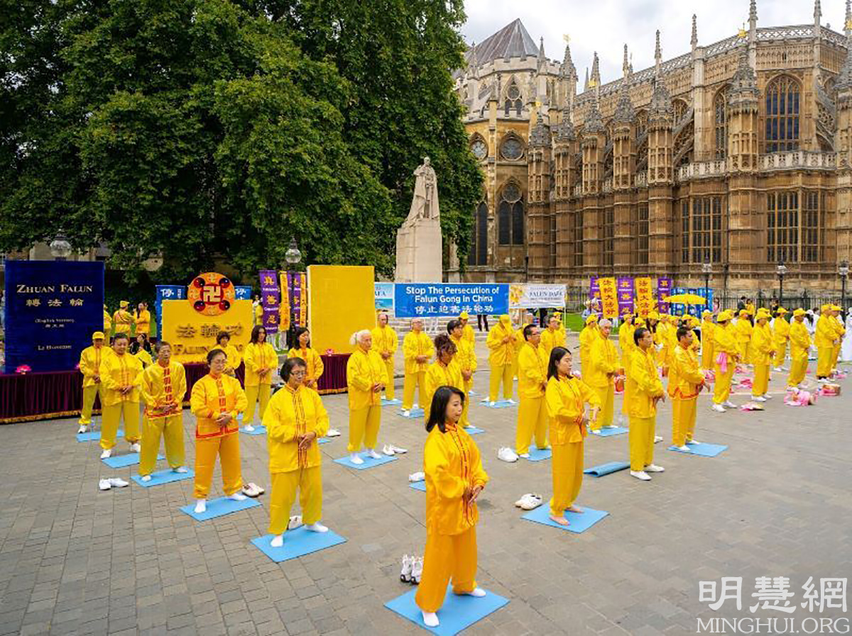 ![]() 图7:二零二一年八月二十八日,英国法轮功学员在伦敦议会广场上演示功法。 |