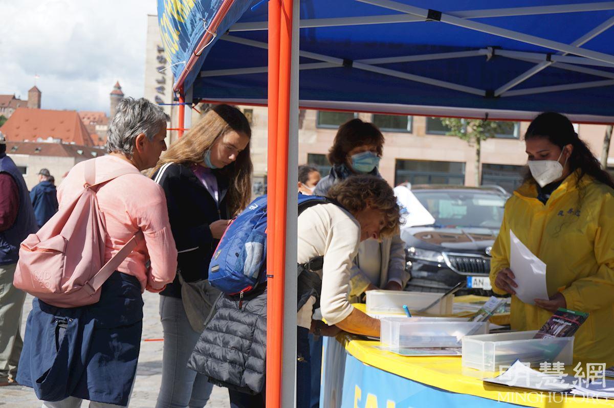 有些纽伦堡市民仔细询问法轮功学员在纽伦堡的炼功地点和集体炼功时间,并表示他们会来学炼法轮功。