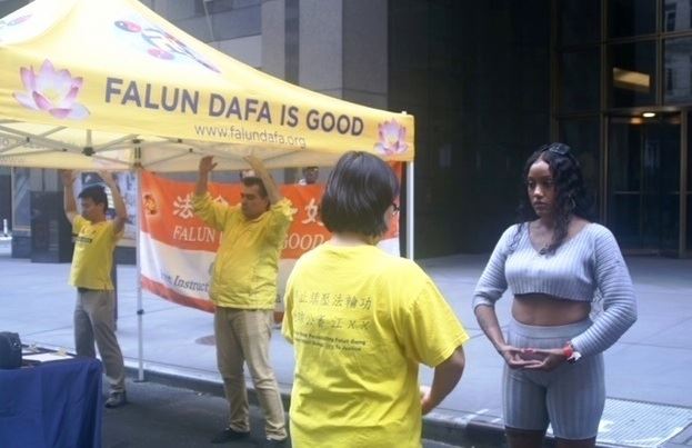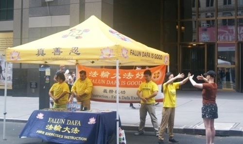 法轮功展位在百老汇剧院(Broadway Theatre)边上。该剧院有近百年历史,过去一年多来因为疫情关闭,今年六月一日才重新开放,当天经过这一著名地标的人群流量相当大,于是,美丽祥和的法轮功展位吸引了很多来自各地的有缘民众。他们相继而来了解反迫害真相并学炼法轮功的五套功法。有一位纽约人分享了他的亲人修炼法轮功之后身心受益、家庭和睦的故事。