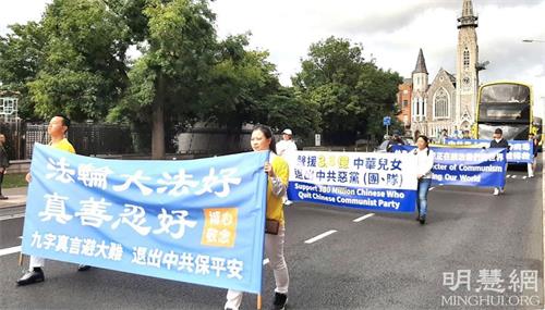 '图1~4:二零二一年九月二十五日,爱尔兰法轮功学员在首都都柏林市中心举行了游行和集会,声援3.84亿中国民众三退。图为游行队伍。'