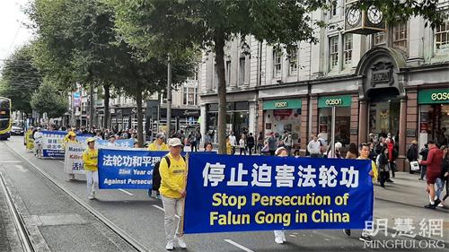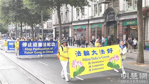 图1~4:二零二一年九月二十五日,爱尔兰法轮功学员在首都都柏林市中心举行了游行和集会,声援3.84亿中国民众三退。图为游行队伍。