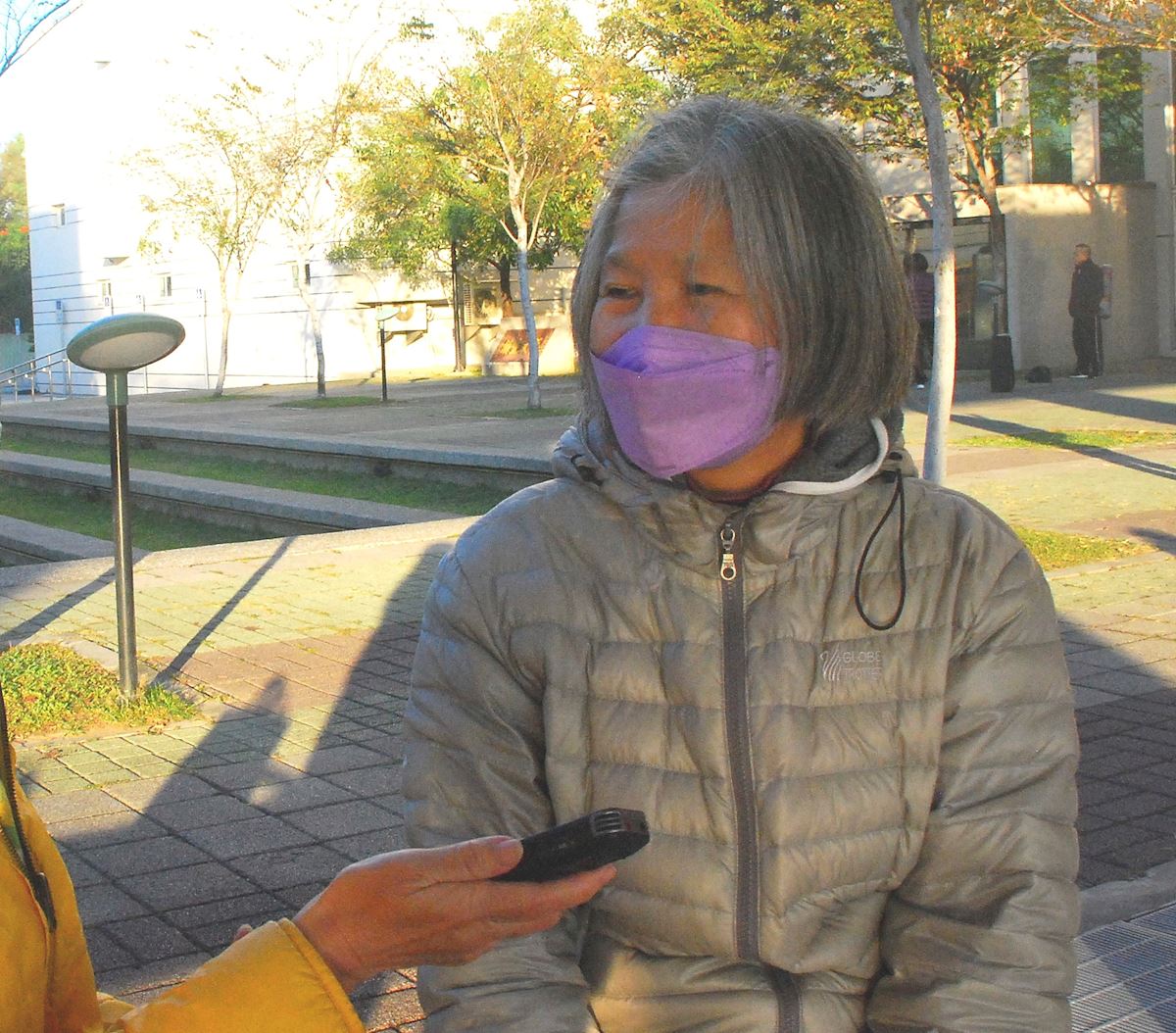 一位散步的女士坐在石椅上静静观看,她在嘉义市许多公园常看到法轮功学员炼功,她说也想炼,只是因照顾孙子没时间炼:“法轮功非常正向,学员心地善良,炼功使身体健康,中共为什么要打压?”