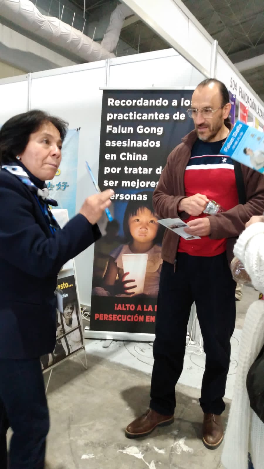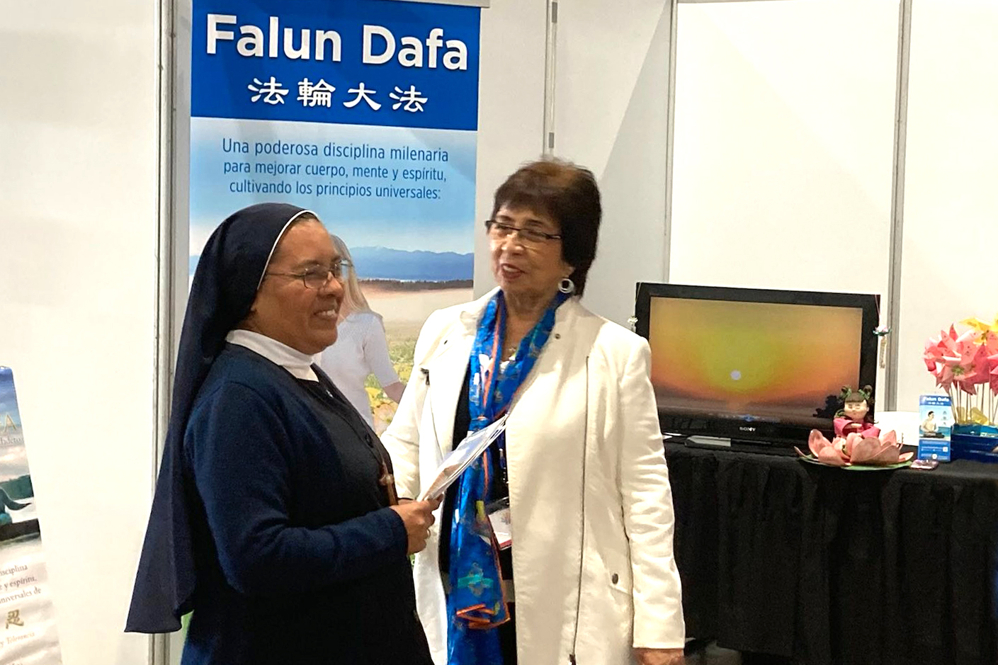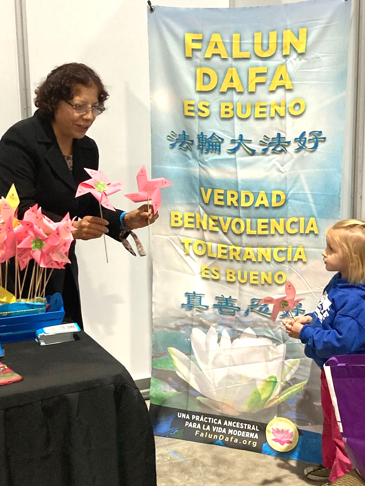 有位中年女士走过法轮大法的展台,被小莲花吸引,走近展位,问学员这是什么,怎么这么好看。学员跟她讲了大法的美好和祛病健身的功效。中年女士说她不久前被诊断为癌症第四期,心里一直很沉重,但是听了学员介绍的大法的美好后,她的眼睛亮起来了,人也精神起来了。她跟同行的朋友说,回去一定上网了解法轮功。她临走前给了学员一个大大的拥抱,感到了得救的希望。