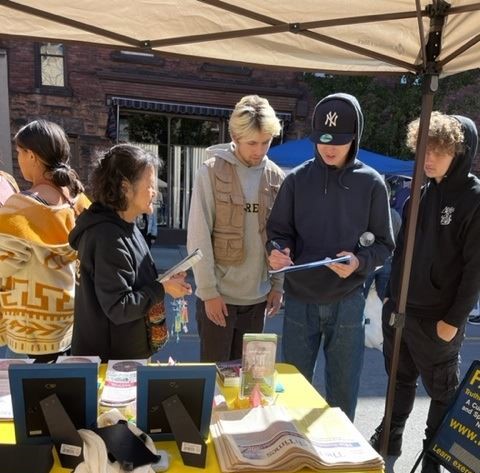 有一位大陆的交换生经过展台,学员给了她一份大法资料。她一边走,一边和寄宿家庭的女主人一起读。女主人了解到大法弟子在国内受迫害的真相,马上掉转头,回到法轮大法的展位,在征签表上签下了自己的名字。