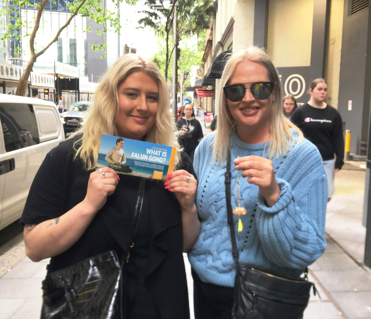 凯瑟琳(Catherine)是一名酒店职员,杰米玛(Jemima)是一名教育工作者,她们从南澳的阿德莱德来悉尼旅游。她们看到法轮功的游行队伍,非常兴奋,不停的在游行现场拍摄。