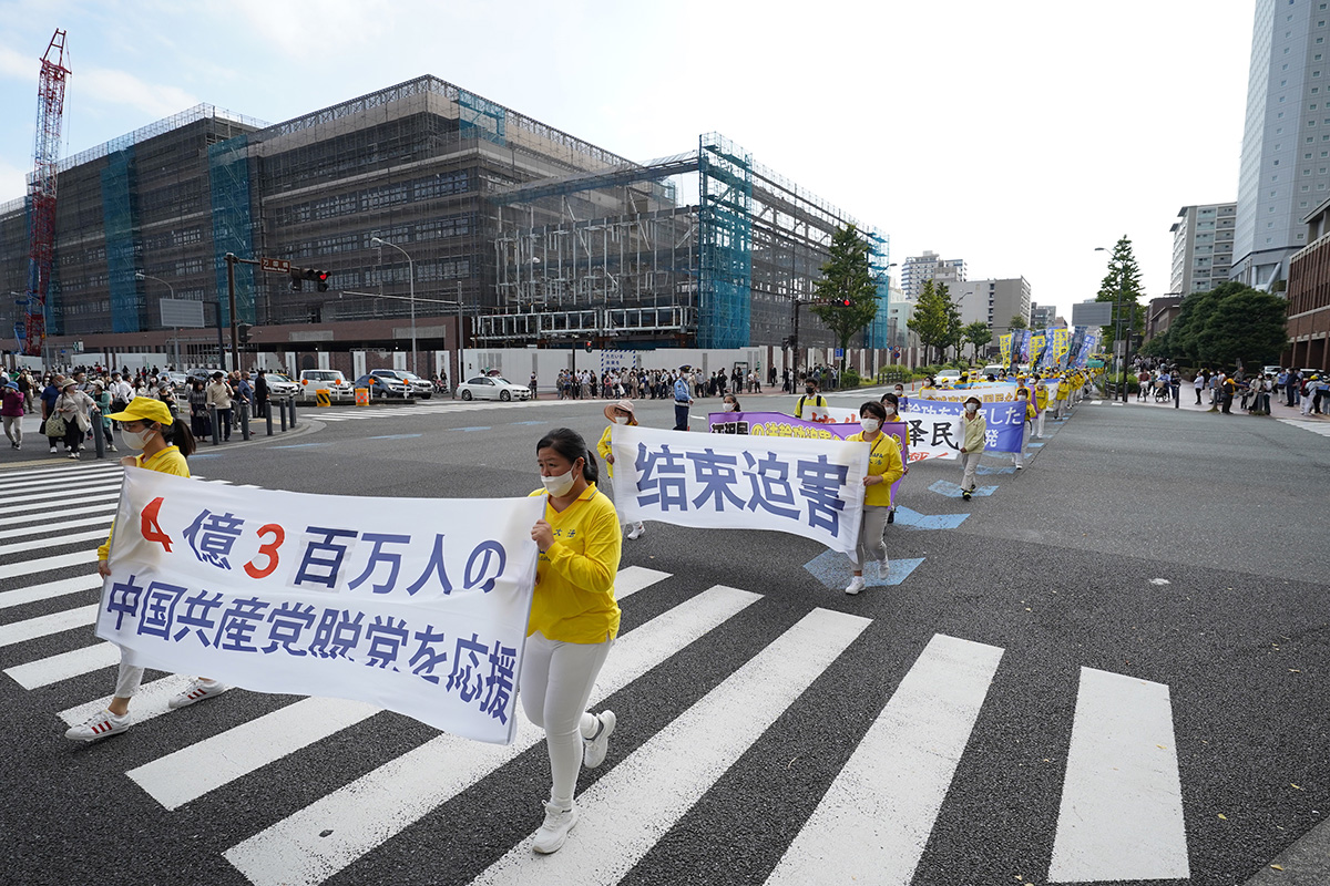 集会结束后,数百名法轮功学员手持“法轮大法好”、“法轮大法在日本”、“四亿中国人退出中共党团队组织”、“打倒中共恶魔”、“中共≠中国”等横幅游行。游行队伍由威武雄壮的天国乐团引领,英姿飒爽的腰鼓队压轴,途经横滨市中心、红砖仓库、中华街等多个旅游景点,引起民众的关注,人们纷纷了解真相。