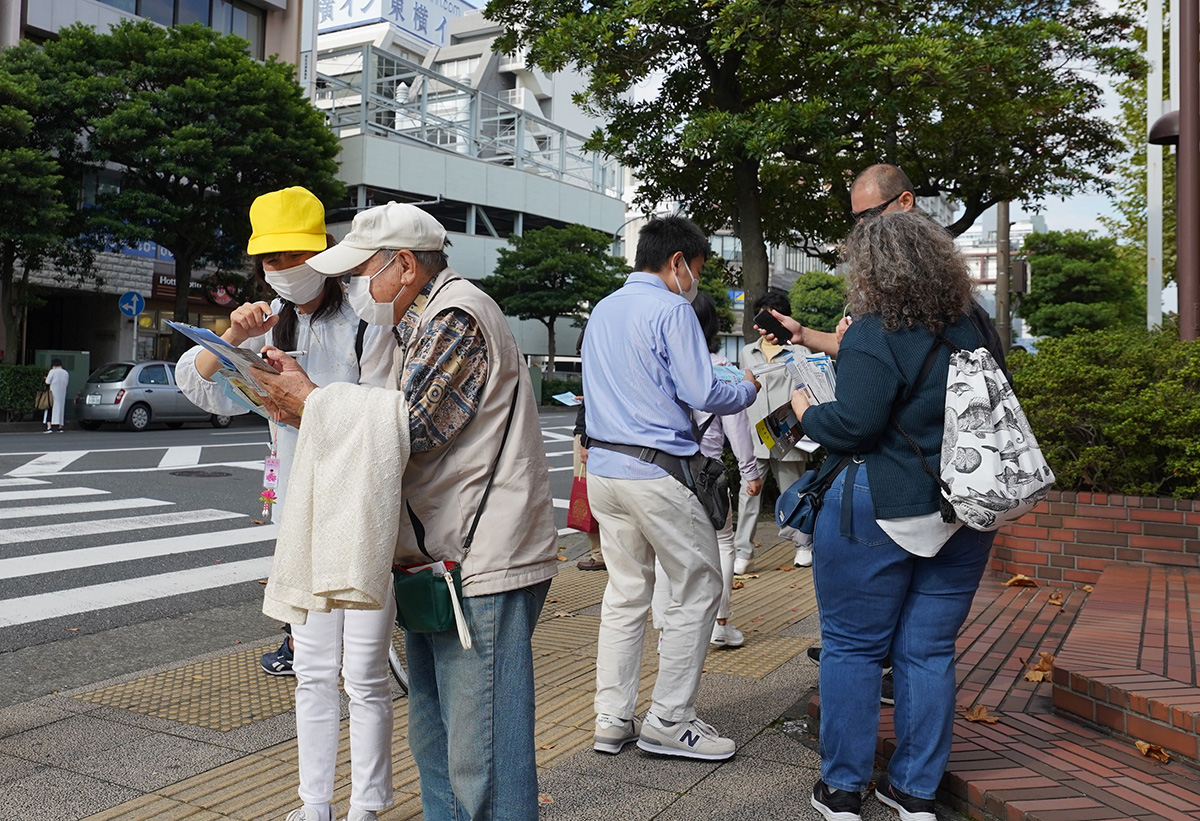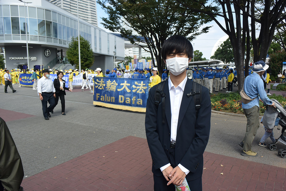 从岐阜県来横滨观光的岩田先生,听完法轮功被迫害的真相后说:“我当然不支持中共(政府),活摘人体器官的事不该发生。请你们加油。”
