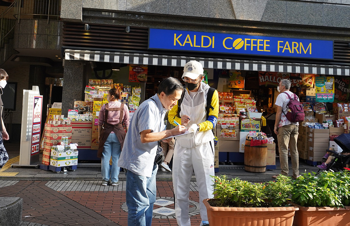 图22:仮屋先生(左)在听法轮功学员讲述真相