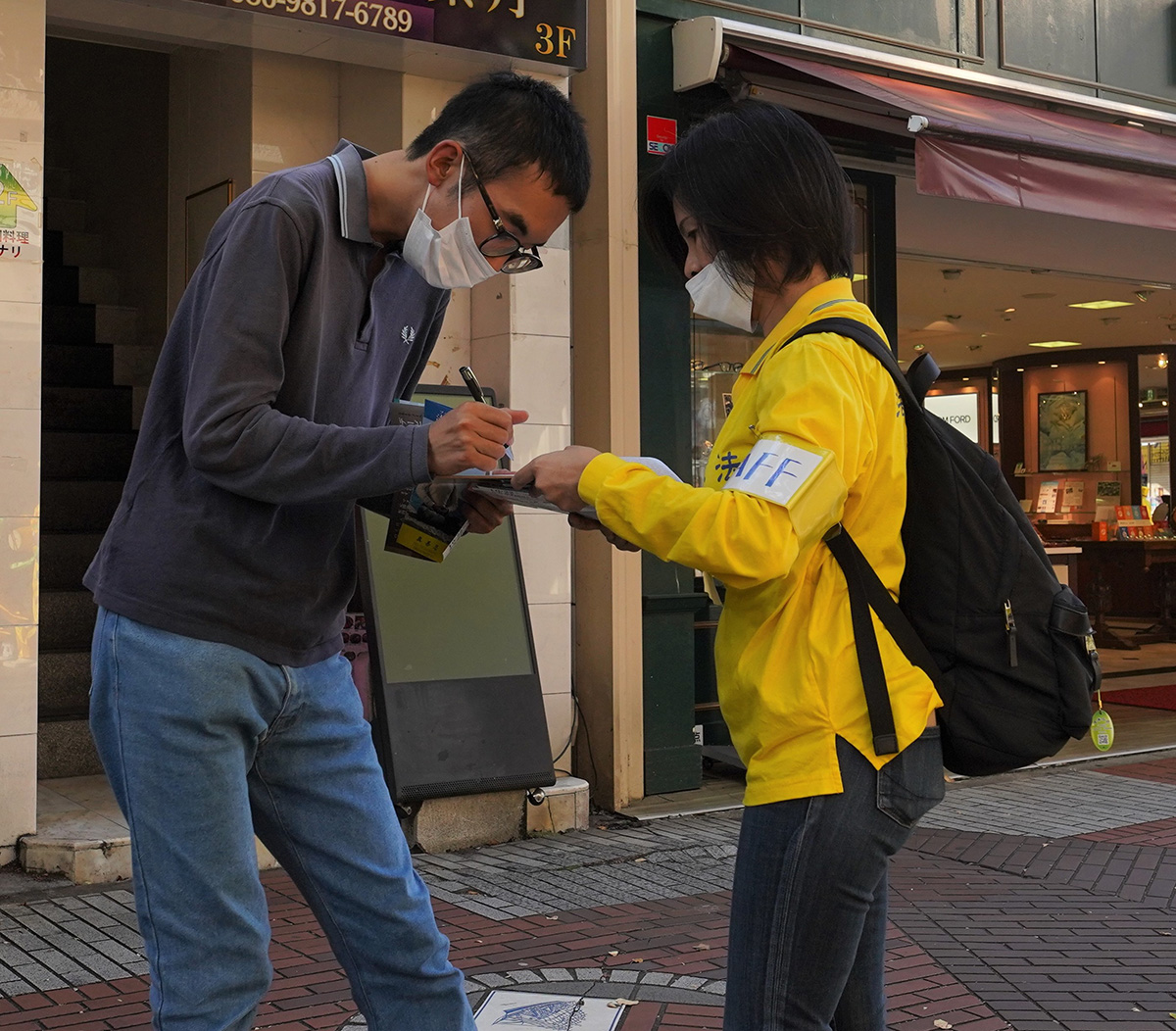 图20:正在签名支持法轮功反迫害的小杉先生(右)