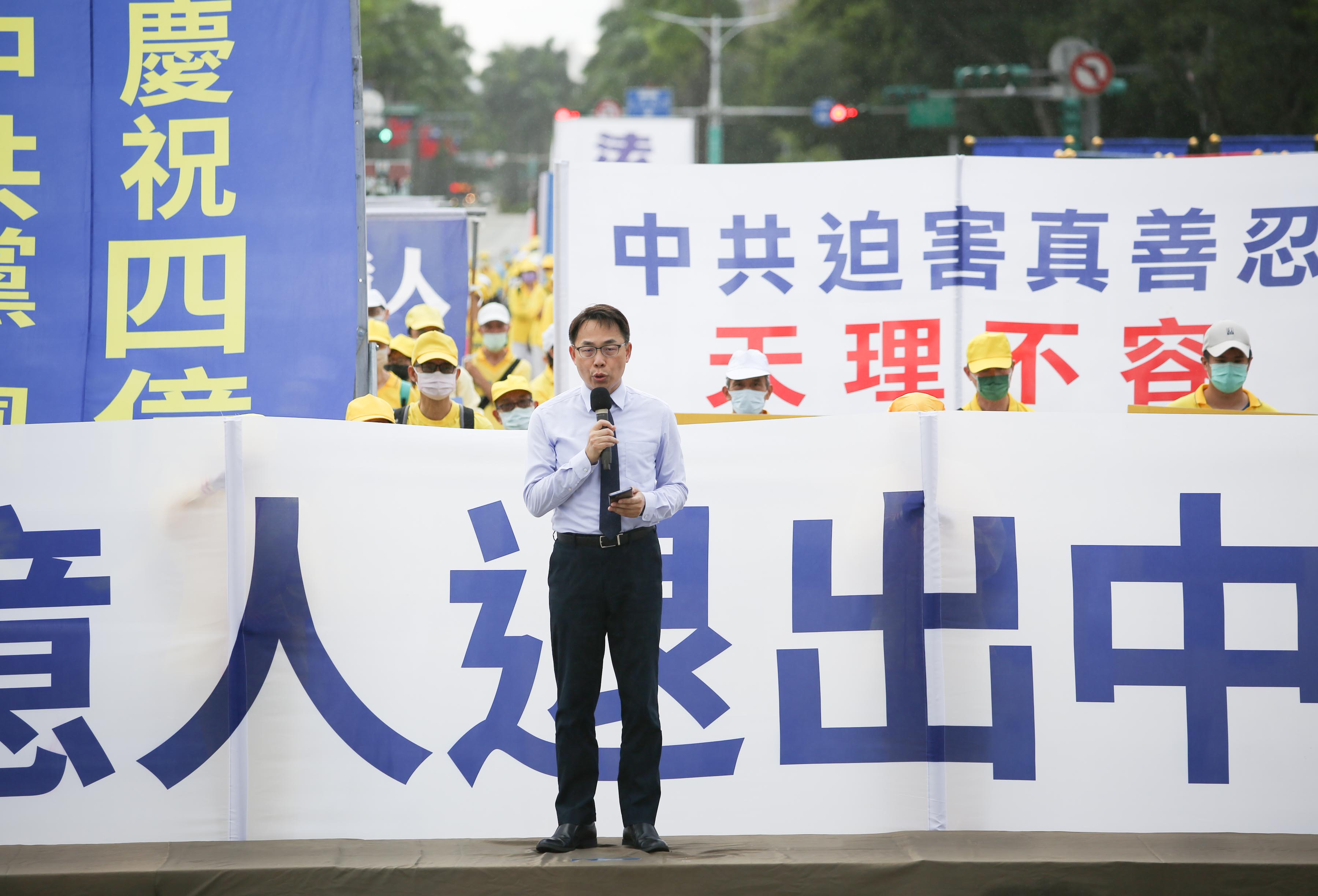 在集会中,台湾法轮大法学会理事长萧松山教授首先发言表示,江泽民集团发动迫害法轮功已经长达二十三年,中共至今仍在迫害学员,甚至活摘器官贩卖……然而由于中共严密监控媒体和网路,一般人很难得知这些事实。他呼吁中国民众“了解事实真相,不要被利用参与迫害法轮功”。