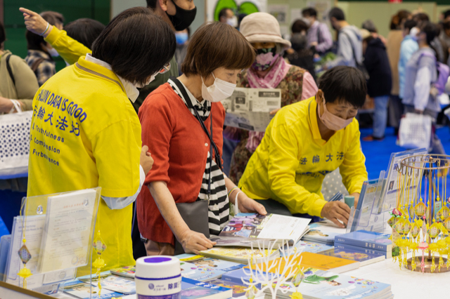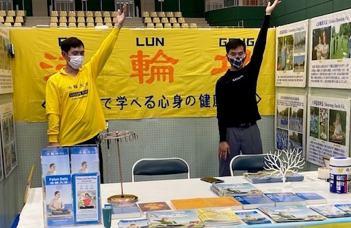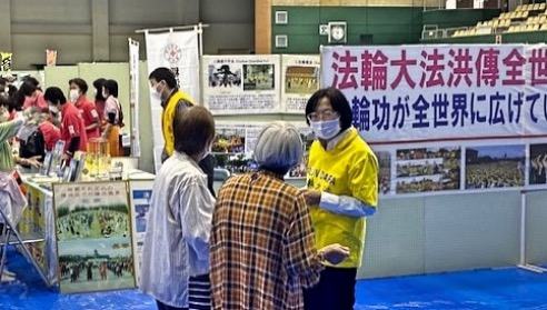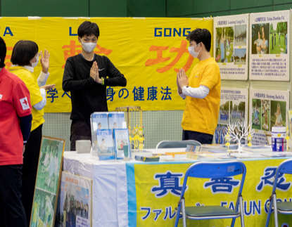 有一位看起来三十岁左右的年轻人,他看到展位上法轮功学员在随着音乐炼功,当场表示想学。于是法轮功学员就教了他第一、第二套功法的动作,之后法轮功学员还告诉了他平常义务教功的地方与时间,并将日文版的《转法轮》与教功DVD借给了他。他向法轮功学员表示感谢。