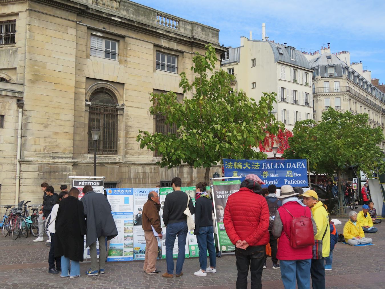 '图1:十月一日下午,法轮功学员在巴黎夏特莱(Châtelet)街区进行了讲真相和征集签名反迫害活动'
