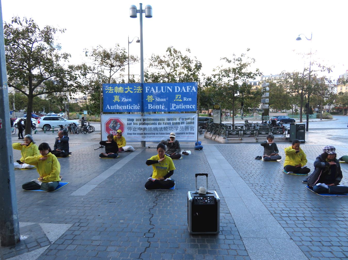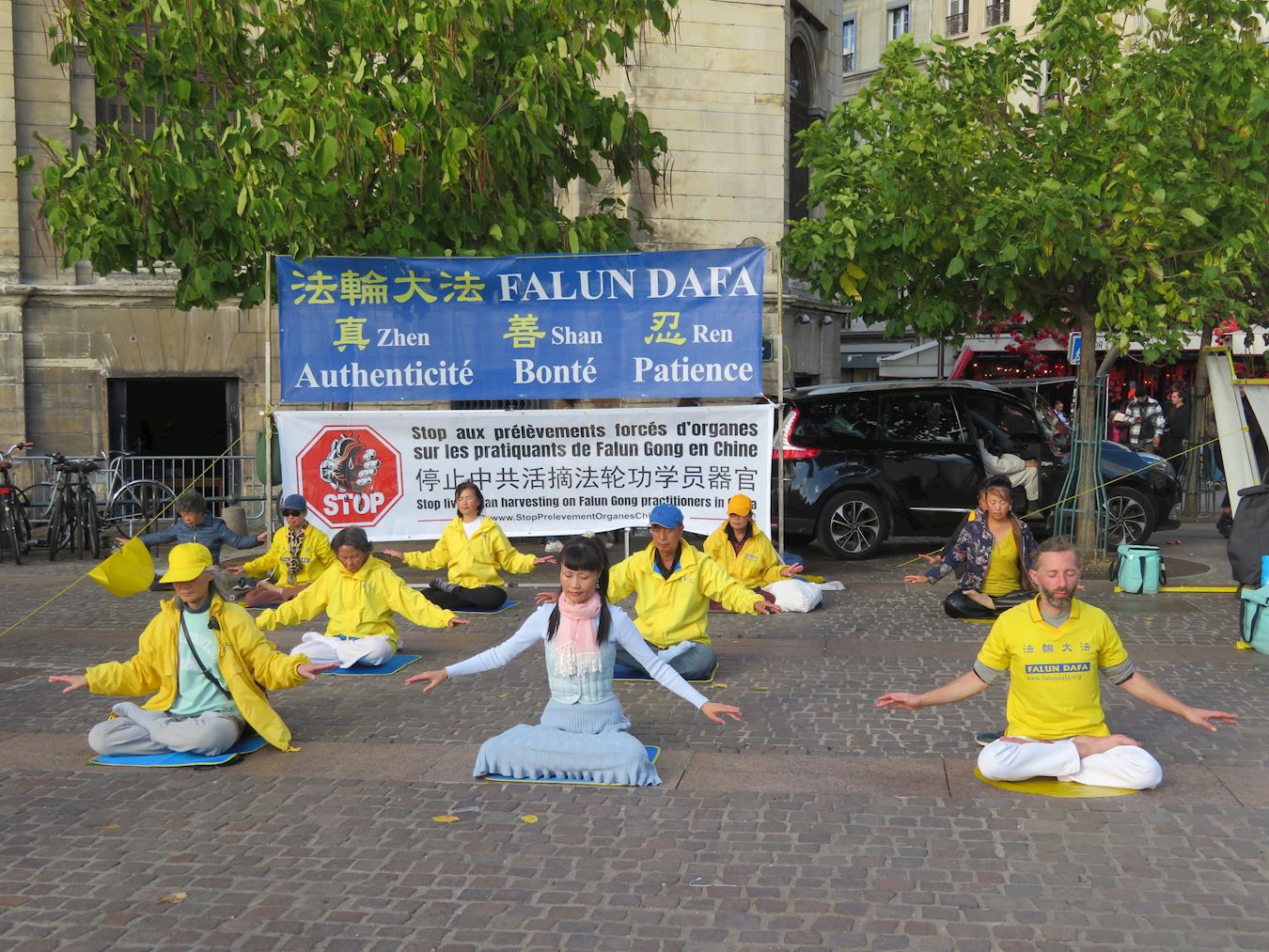 '图2:法轮功学员在巴黎夏特莱街区演示法轮功神通加持法。'