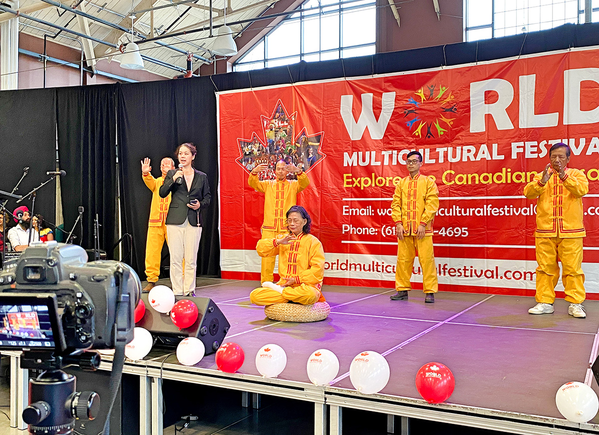 二零二二年十一月二十七日,在加拿大首都渥太华兰斯当公园(Landsdowne Park)的园艺大厦(Horticulture Hall)举行的“世界多元文化节”开幕式的舞台上,五位渥太华法轮功学员身着金色炼功服展示了五套功法,伴随舒缓、平和的动作,法轮功学员戴佳妮为现场数百名观众介绍了法轮大法。