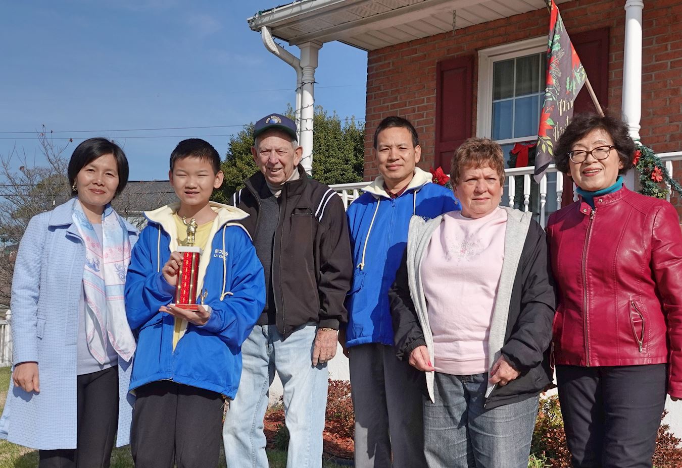 ![]() 图7:巴尔的摩圣诞游行组委会主席汤姆·科尔(Tom Kerr)先生(左三)和游行组委会成员莎伦·科尔(Sharen Kerr)(右二)为法轮功学员获得花车第一名,颁发奖杯。 |