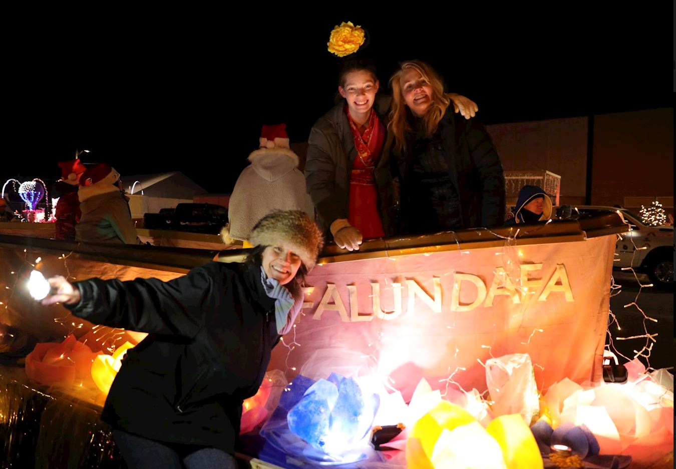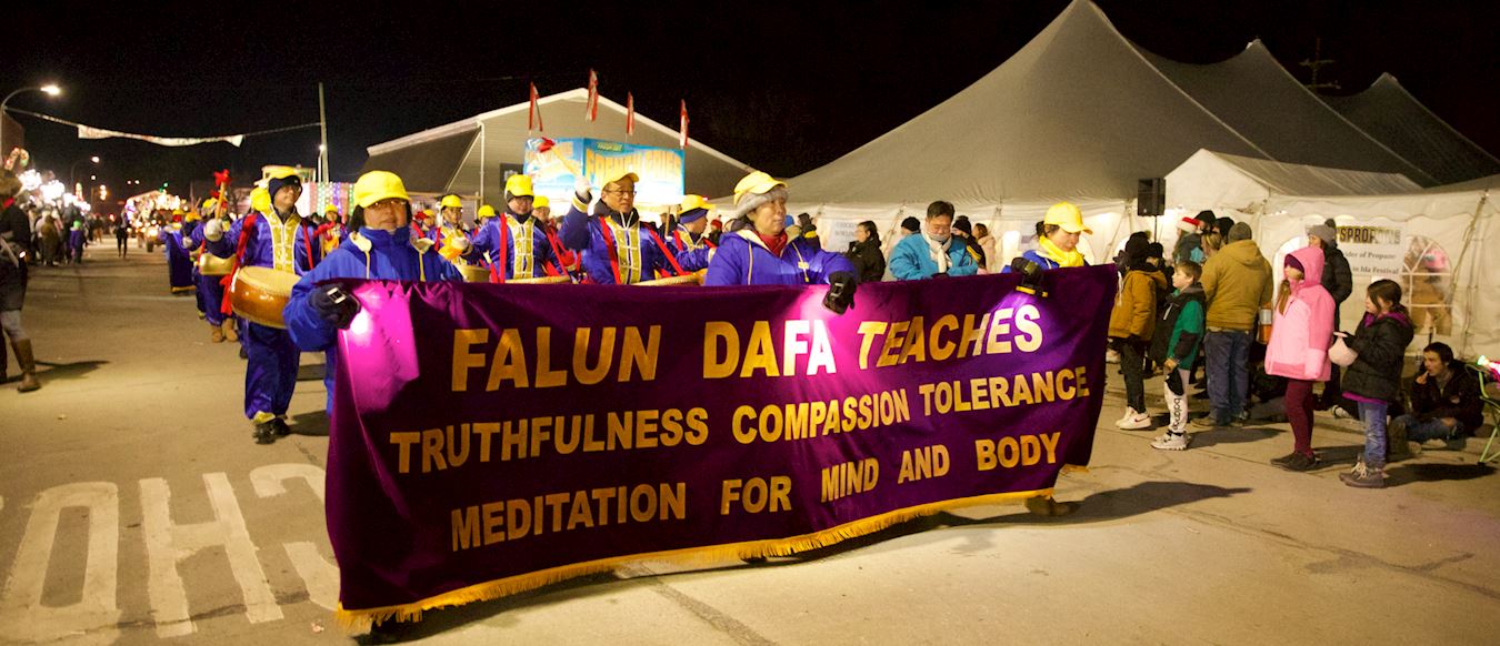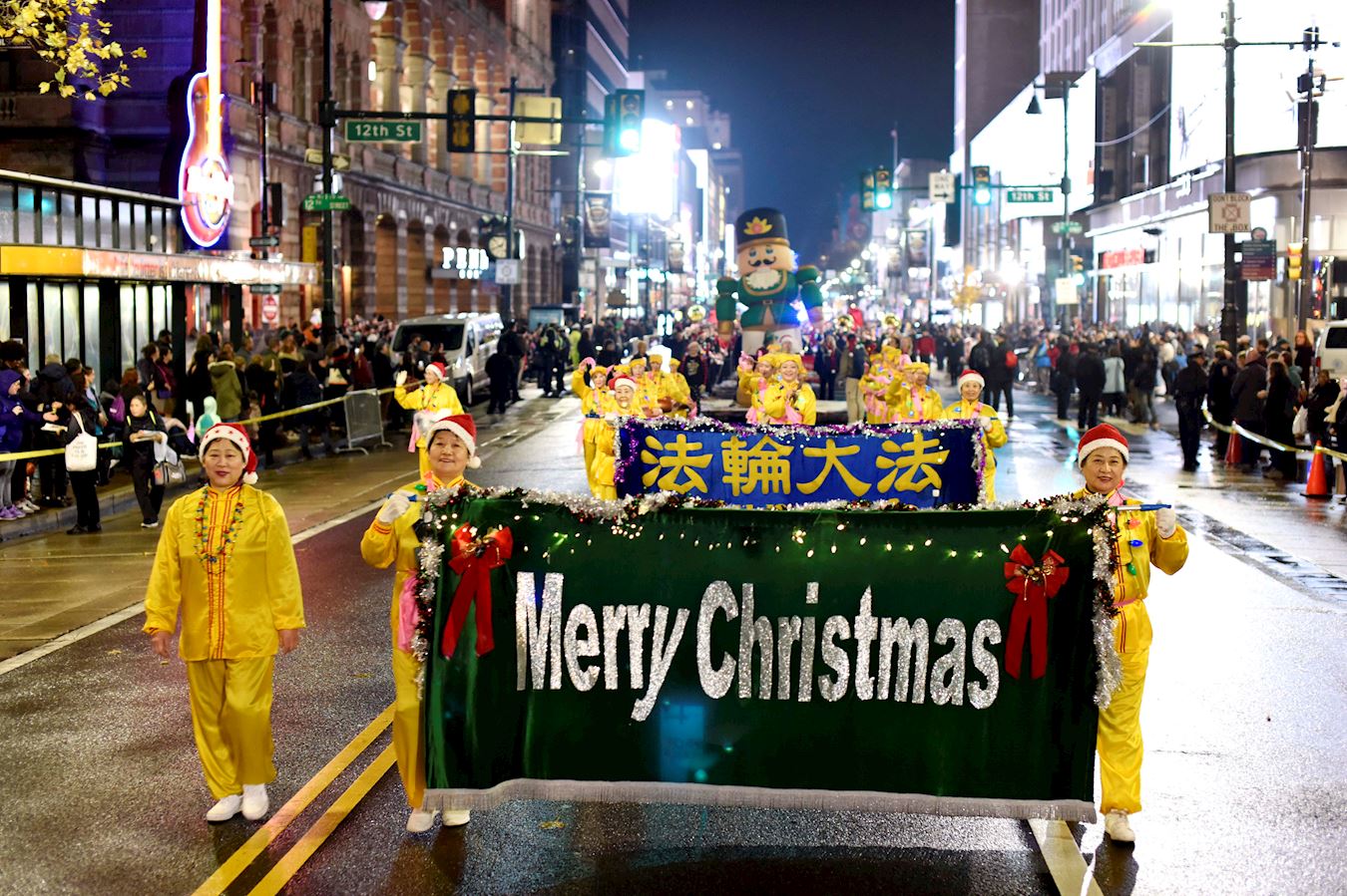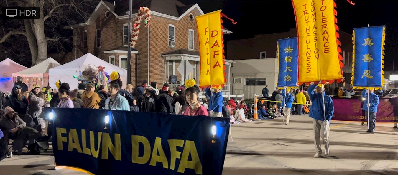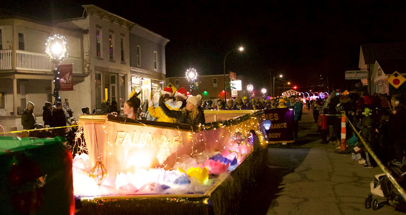 当晚的游行全程长1.4英里。游行队伍中有充气大卡通、节日花车、军乐队、圣诞老人等。鼓乐震天,人声鼎沸。虽然游行开始不久下起了倾盆大雨,但游行队伍依然井然有序,热情不减。法轮功学员的队伍受到沿途民众的热烈欢迎。