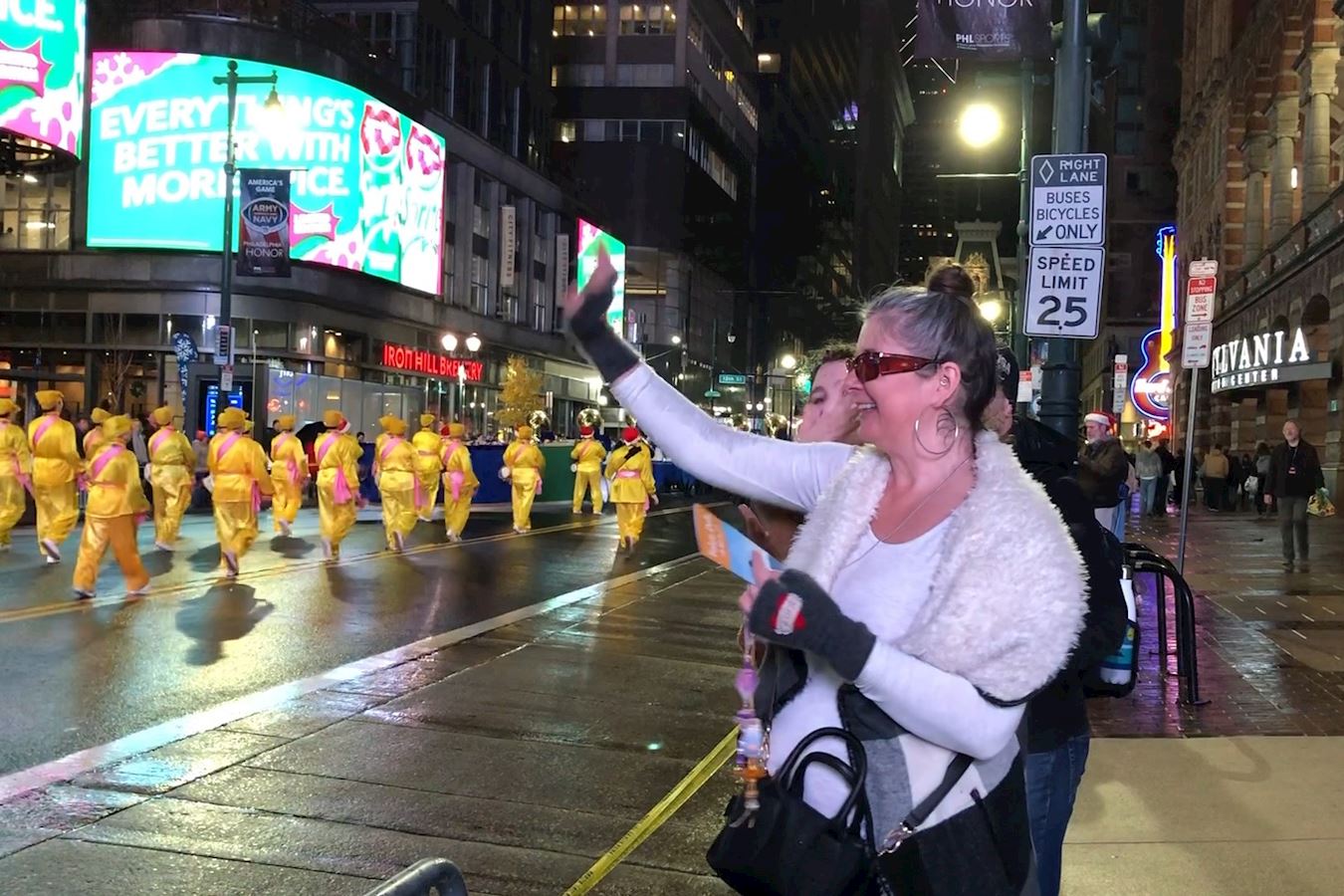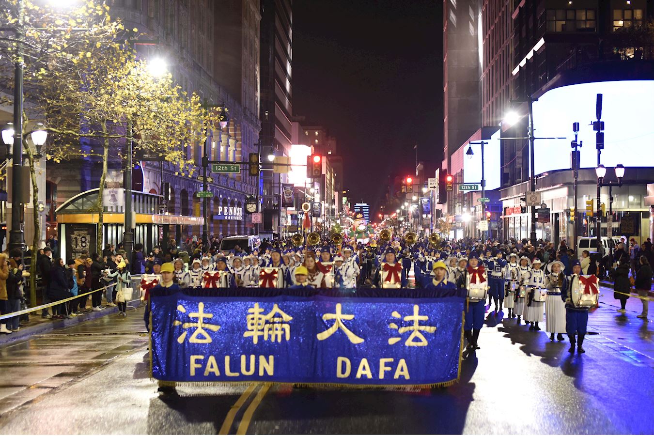 【明慧网二零二二年十二月六日】二零二二年十二月三日晚,在美国费城的市中心举办了大游行,庆祝圣诞节、中国新年、犹太人的光明节(Hanukkah)、非裔美国人的宽扎节(Kwanza)等多个传统节日。由法轮功学员组成的天国乐团和腰鼓队前来参加。受到沿途民众的热烈欢迎。