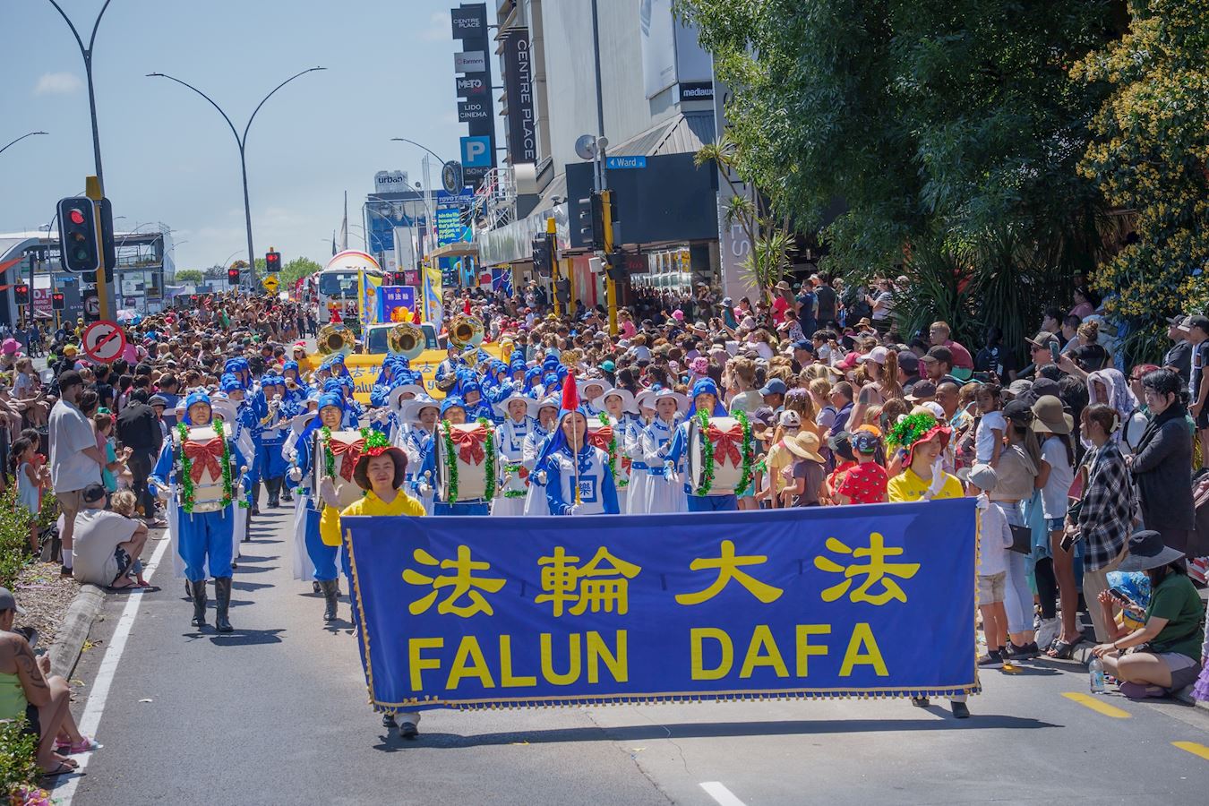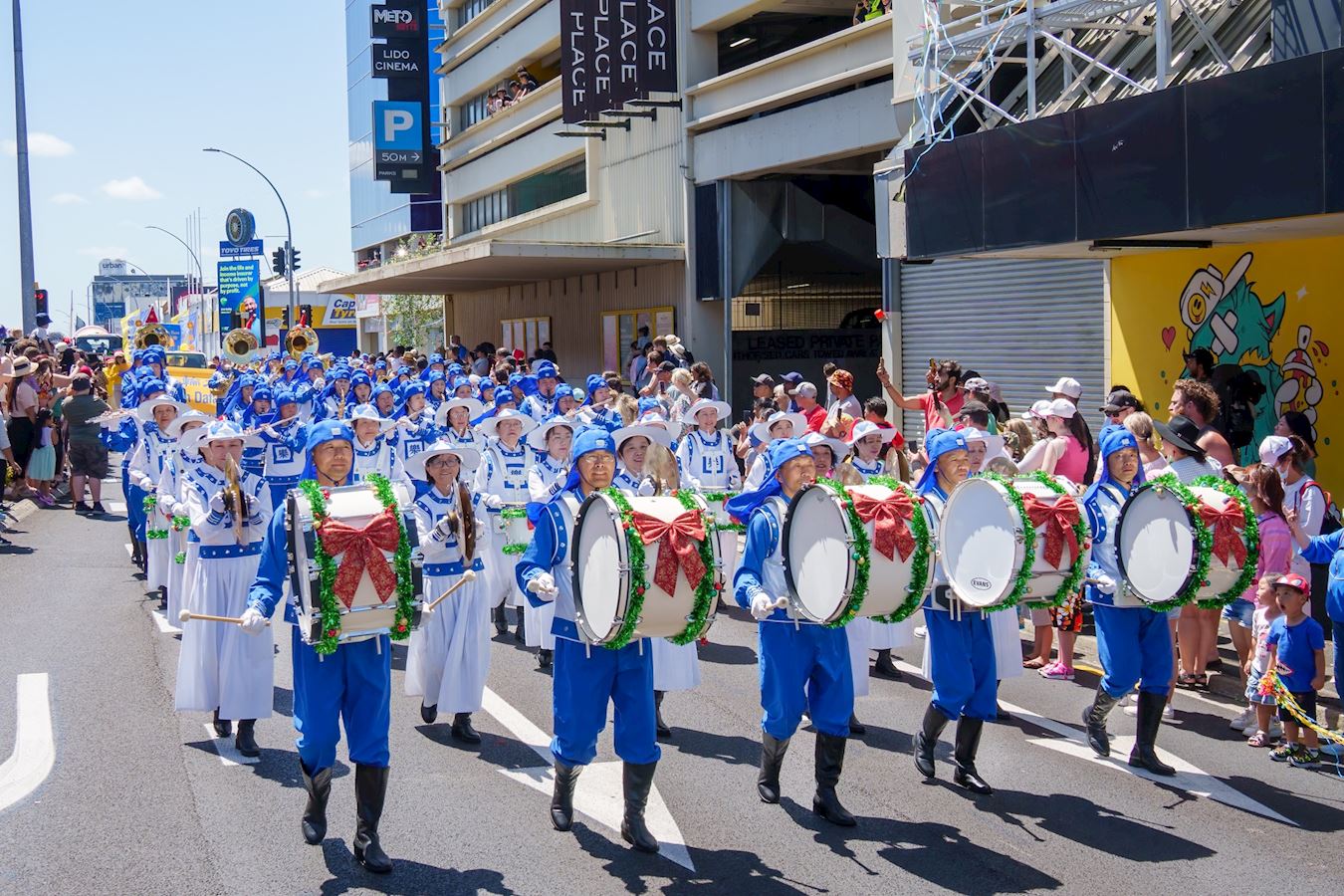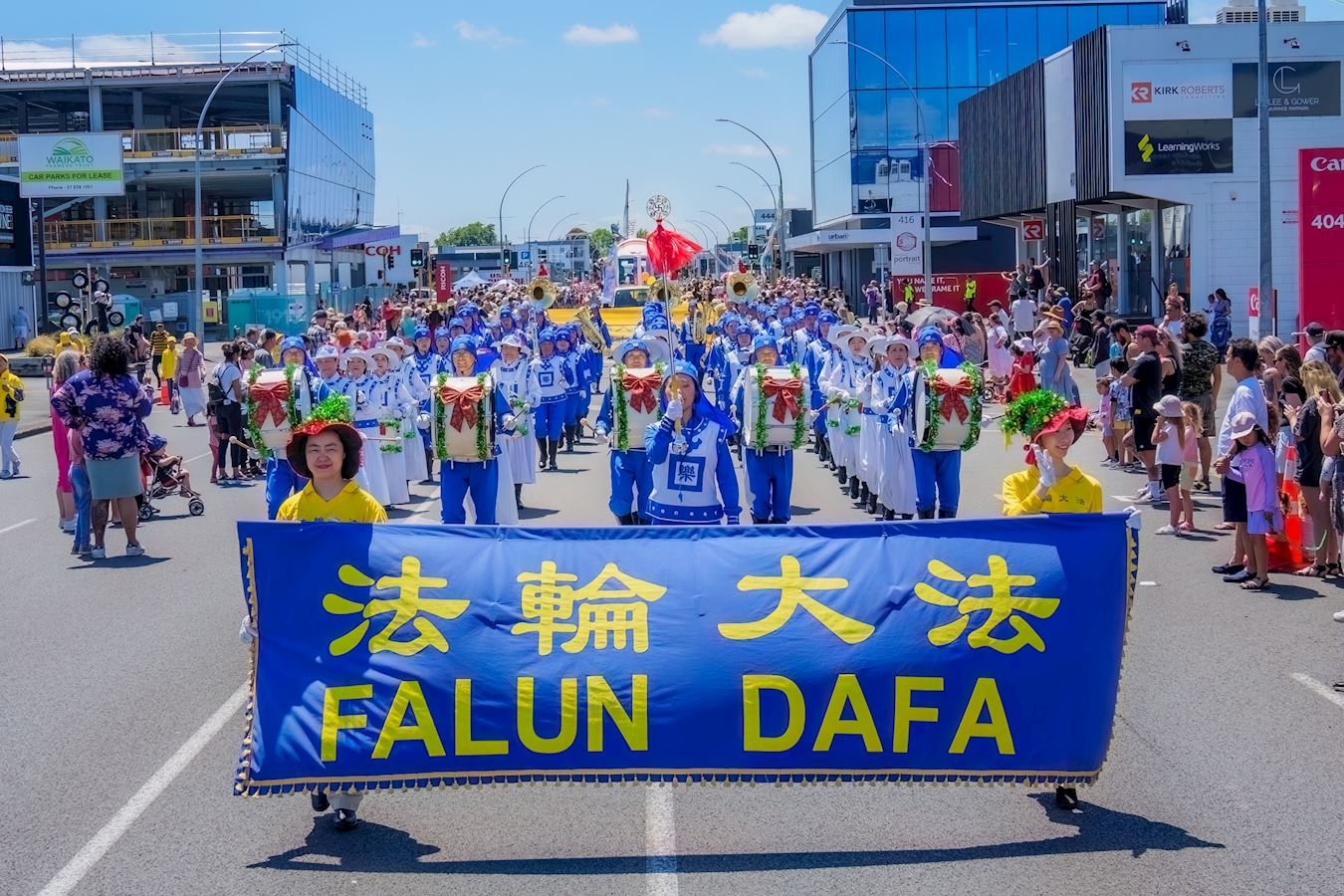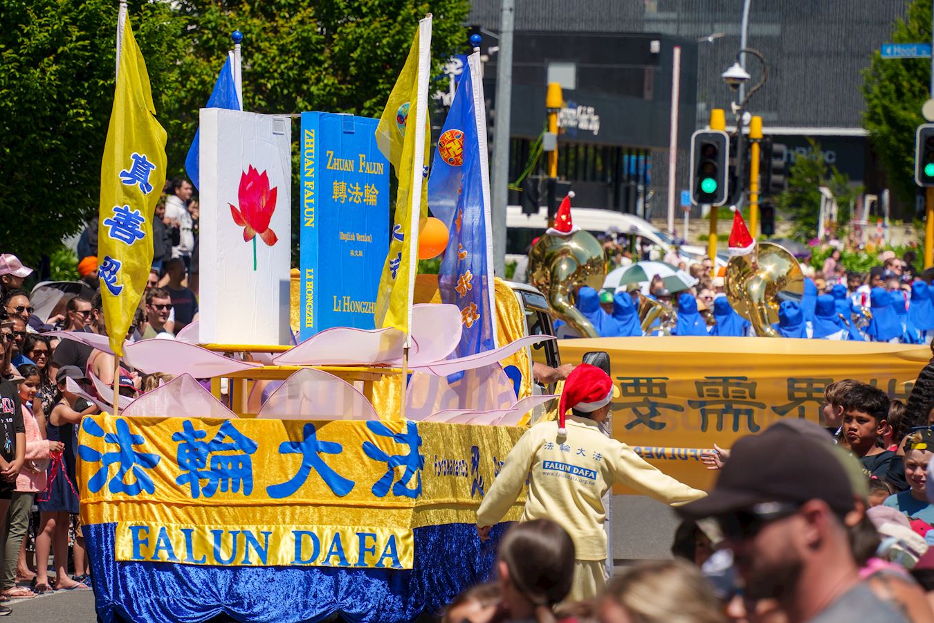 【明慧网二零二二年十二月七日】(明慧新西兰记者站报道)二零二二年十二月三、四日周末两天,新西兰法轮功团体参加了奥克兰(Auckland)的三个区(Onehunga、Manurewa、Brownsbay)、哈密尔顿市(Hamilton)、北帕市(Palmerston North)、特阿姆图镇(Te Awamutu)以及剑桥镇(Cambridge)八场圣诞游行。游行队伍中,法轮功学员组成的天国乐团、腰鼓队和舞龙队精彩纷呈的表演让人们赞叹不已。