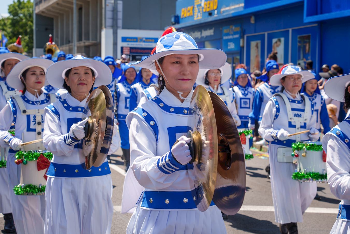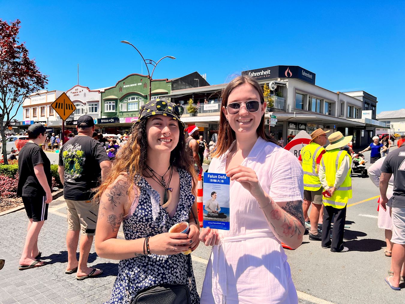 赫莲娜(Helena)和露西(Lucy)在附近咖啡馆工作,她们开心地说:“这支游行队伍是我们今天的最爱,他们蓝白相间的服饰太漂亮了,我们都想加入,可惜我们不会什么乐器,但是我们可以打横幅。真、善、忍的理念很棒,这是我们都应该具有的品德。”