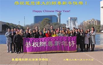 美国德克萨斯州奥斯汀、休士顿、达拉斯、都柏林、阿肯色州大法弟子恭祝慈悲伟大的师尊新年好!