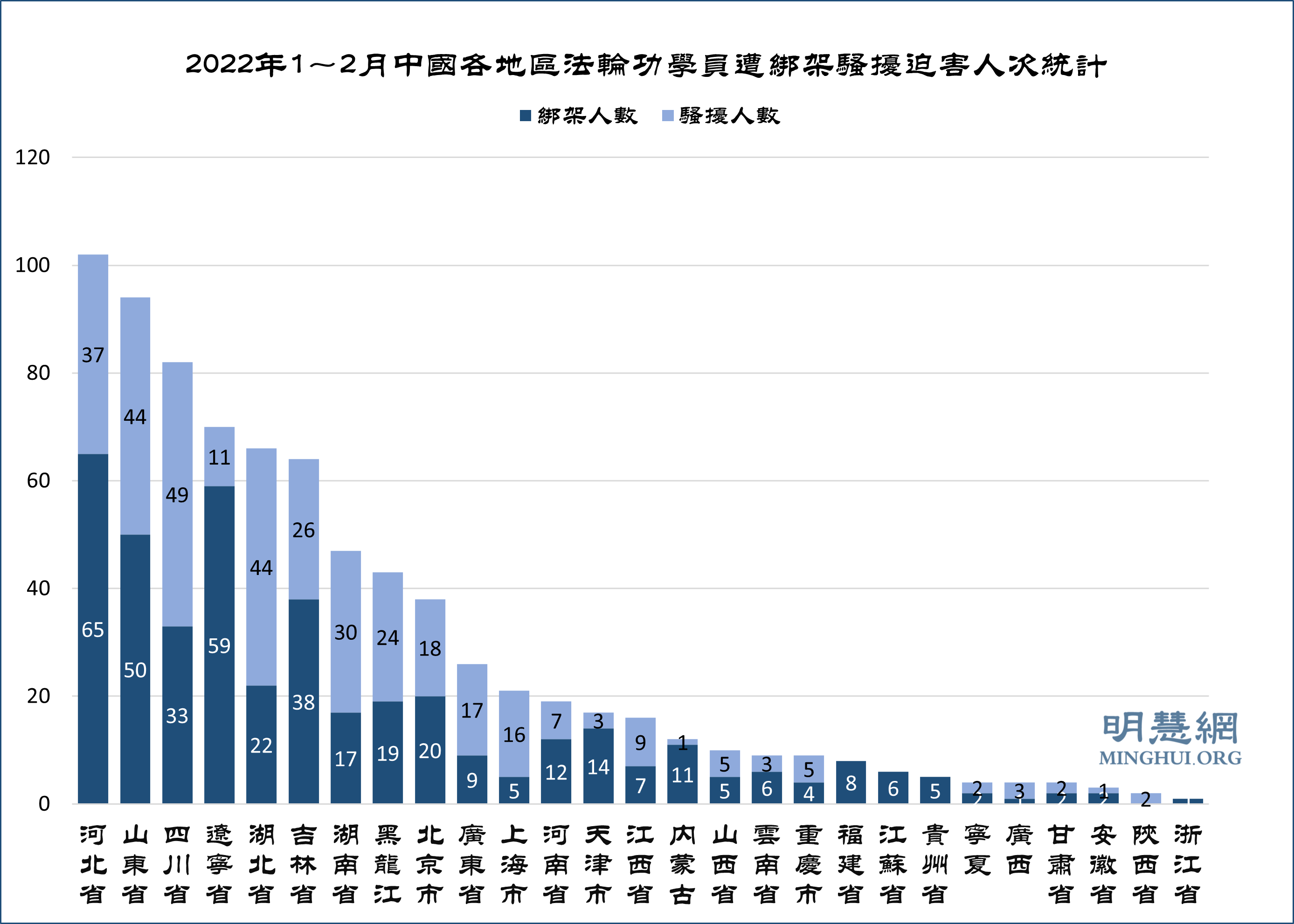![]() 图2:2022年1~2月中国各地区法轮功学员遭绑架骚扰迫害人次统计 |