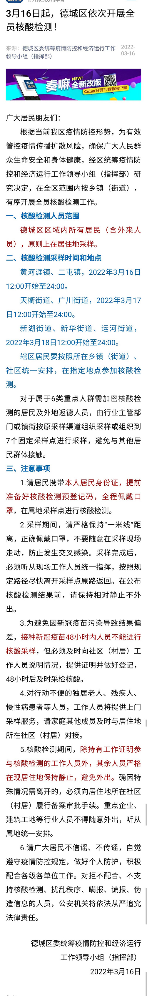 山东淄博全区进行全员居家核酸检测已经三天。据悉,山东招远市全市范围原定持续五轮的核酸检测大部分已进行到两轮,在今晨凌晨(三月十六日)紧急叫停,原因不明。而德州市德城区官方没有报道有感染病例,但是三月十六日起,全员进行核酸检测。