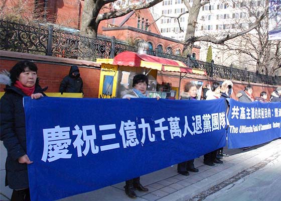 三月四日,多伦多部份法轮功学员在市中心,举办真相横幅展和征签活动,声援3.9亿中国人退出中共党、团、队组织,呼吁全世界更多人认清中共本质,抵制中共渗透。