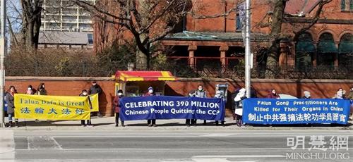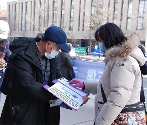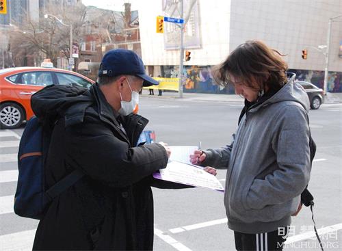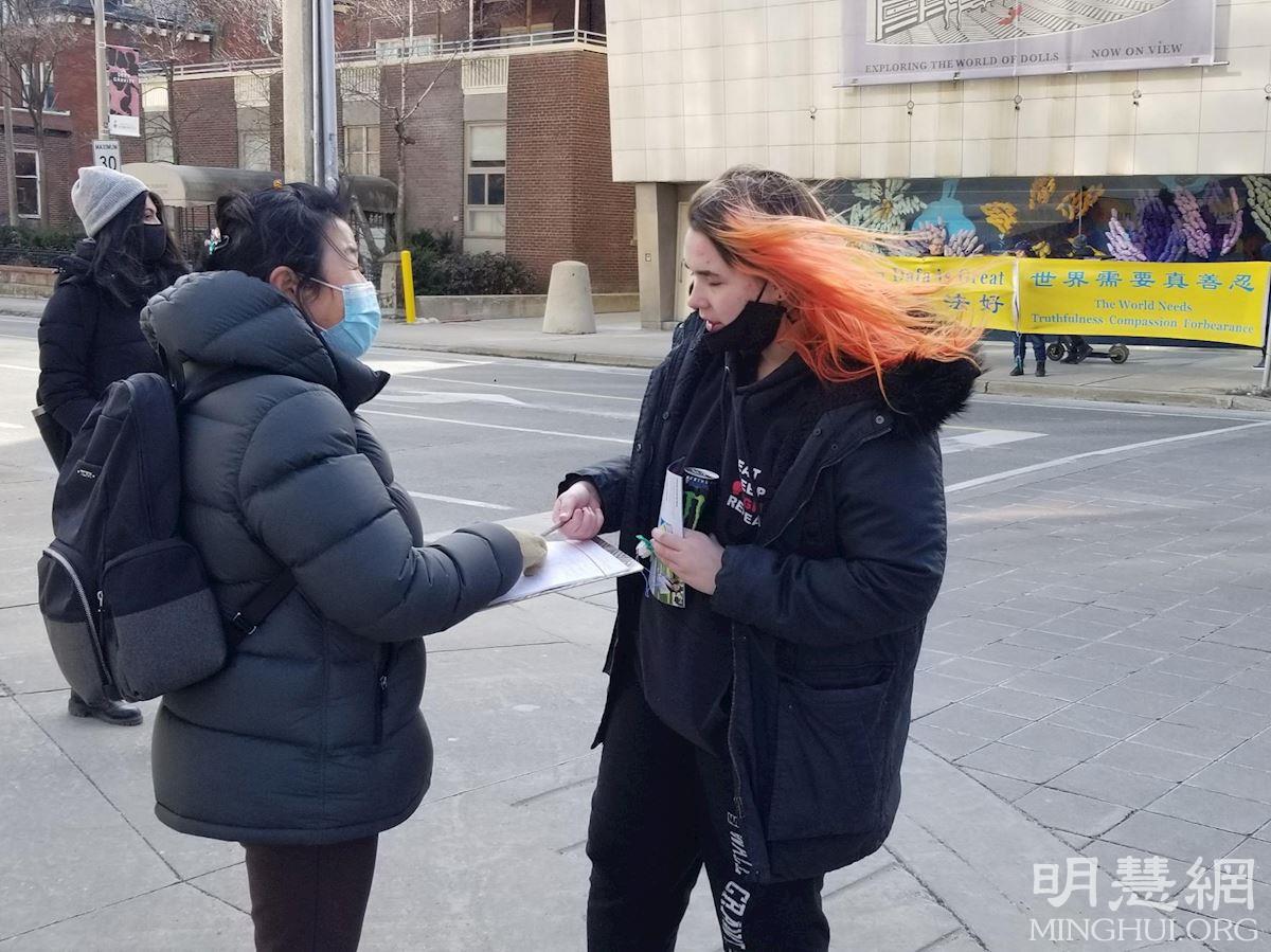 【明慧网二零二二年三月六日】(明慧多伦多记者站报道)二零二二年三月四日下午,加拿大多伦多部份法轮功学员在市中心布鲁尔街和圣乔治街(Bloor & St. George)的交界处,举办真相横幅展和征签活动,声援三亿九千多万中国人退出中共党、团、队组织,呼吁全世界更多人认清中共本质,抵制中共渗透。同时呼吁立即停止中共对法轮功的迫害