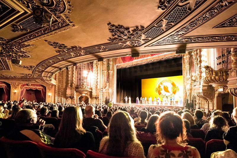 '图4:二零二二年三月五日至六日神韵国际艺术团在美国哥伦布市的俄亥俄剧院(Ohio Theatre)演出两场。在雷鸣般的掌声中演员两次谢幕。图为三月六日演出谢幕照。(大纪元)'