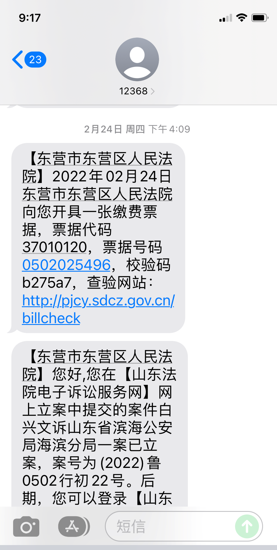 因分局警察在此过程中再次出现多处违法行为,白兴文遂于二零二二年一月十七日依法向东营市东营区法院提诉公安机关行政处罚违法。二零二二年二月二十四日,白兴文收到东营区法院的多条短信通知,告知该行政诉讼已经成功立案。
