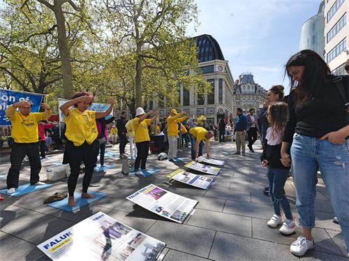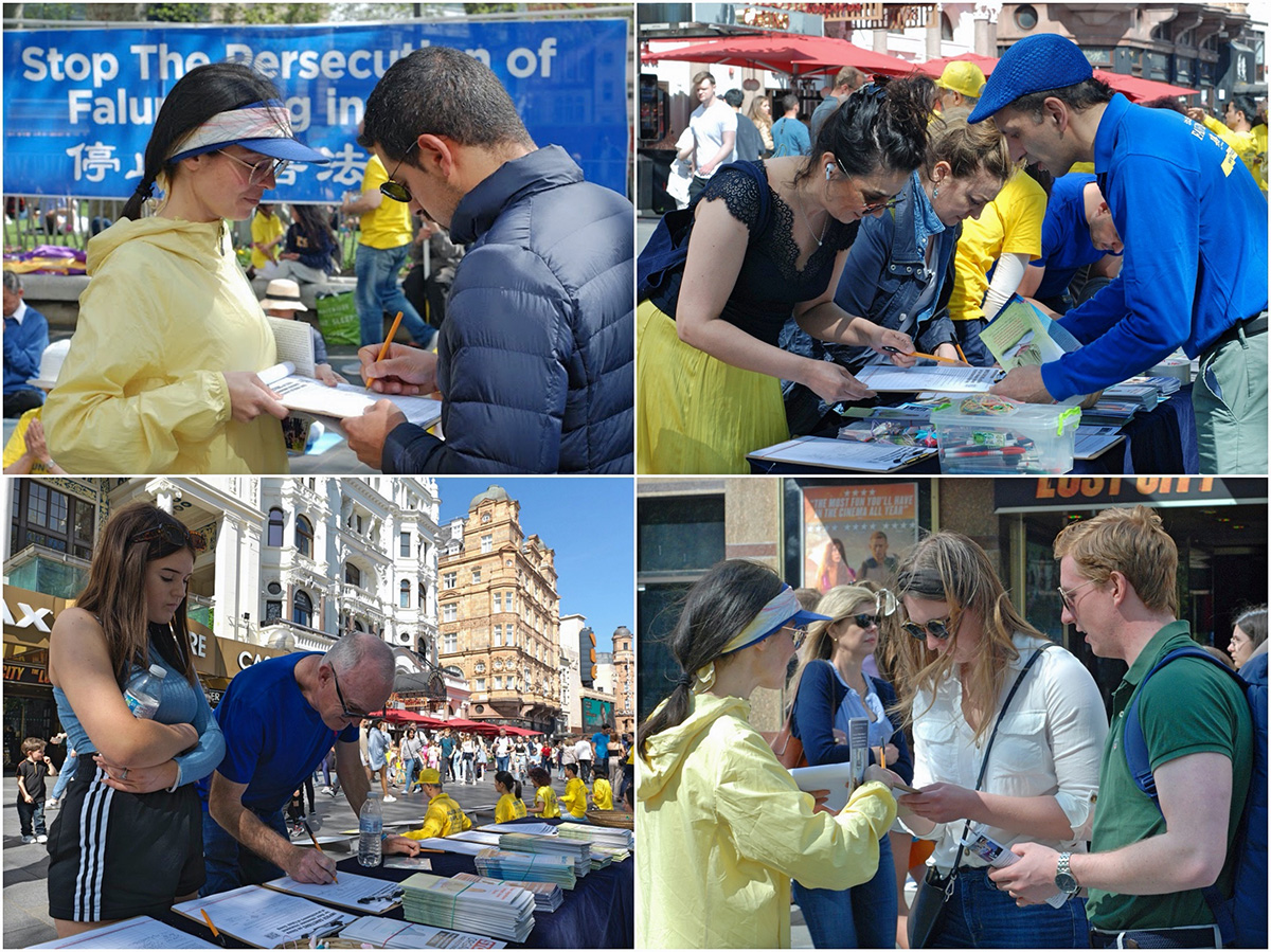 这天伦敦难得的阳光明媚,大街上游人如织。学员们在伦敦人流最多的莱斯特广场、圣马丁广场、中国城、大英博物馆的弘法讲真相活动从中午进行到傍晚,吸引了很多路人的关注。