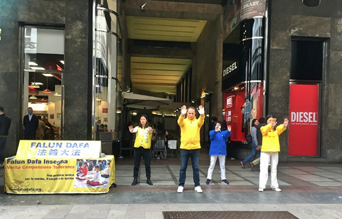 ![]() 图1~2:二零二二年四月二十三日,意大利部分法轮功学员在米兰市中心举行活动,传播法轮功的真相。图为学员们在在悠扬的音乐中展示法轮功功法。 |