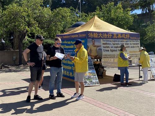中国民主党洛杉矶分部主席葛坤,在圣地亚哥巴博亚公园遇到了法轮功学员的真相展位。