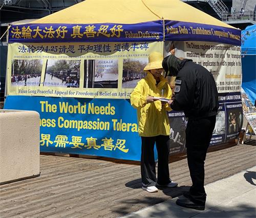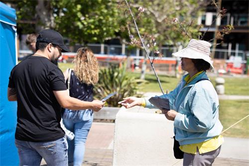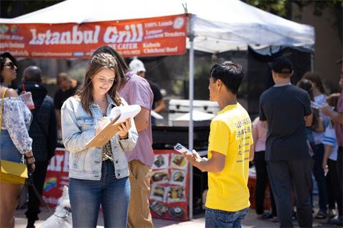 法轮功学员给两位年轻的中国留学生介绍法轮功真相,他们听得很认真,并且带走了退党网站网址,表示要自己上网了解更多。