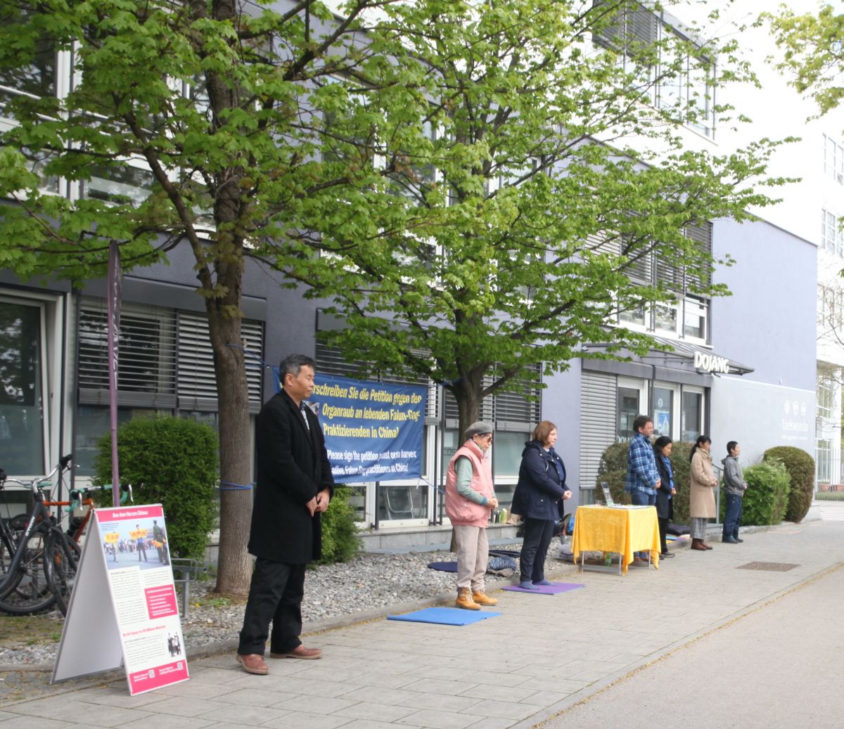 在慕尼黑中领馆斜对面街上,法轮功学员举办了和平抗议活动。
