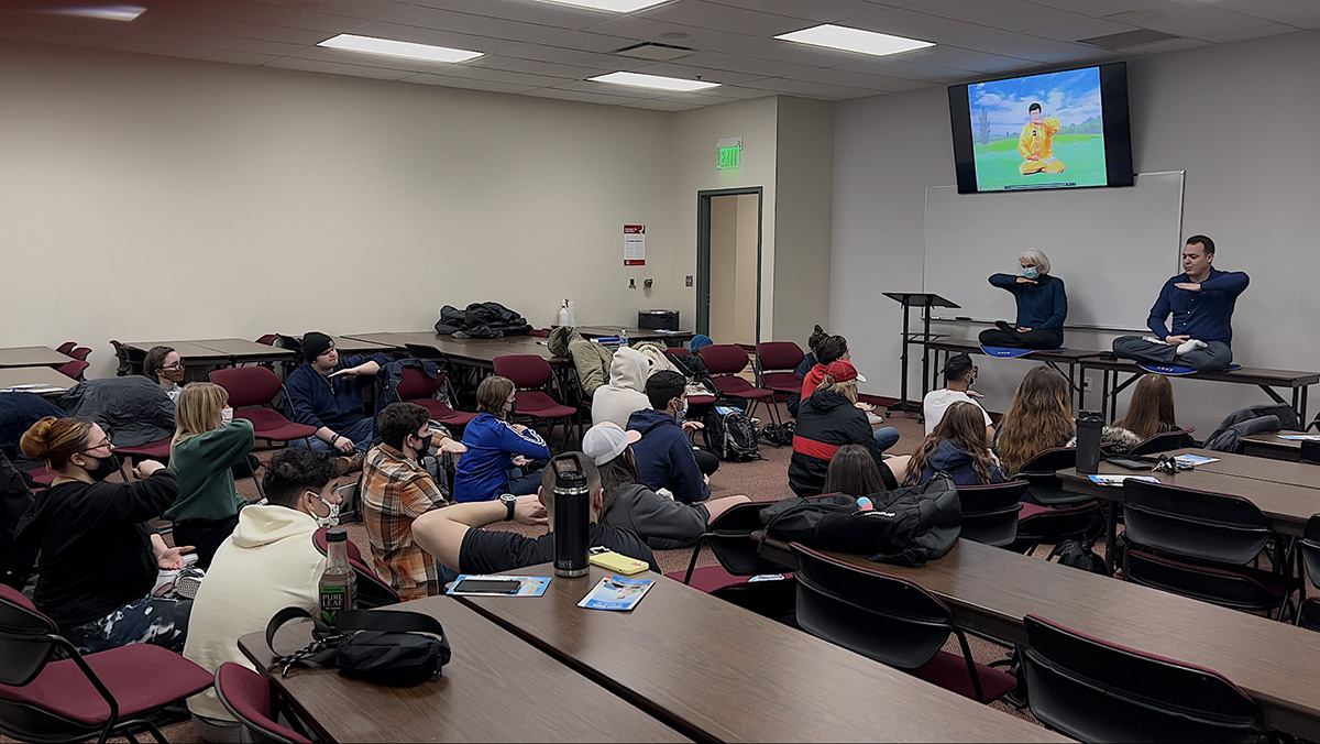图7:二月二十二日,法轮功学员在课堂上教学生们动功。右一为休伊教授