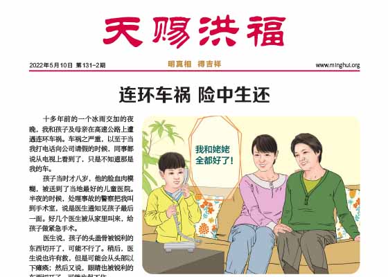 我们听了法轮功学员讲的真相,诚念九字真言,所以在一场重大车祸事故中幸免于难。借此世界法轮大法日之际,叩谢李大师救命之恩!