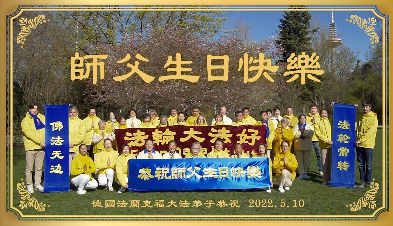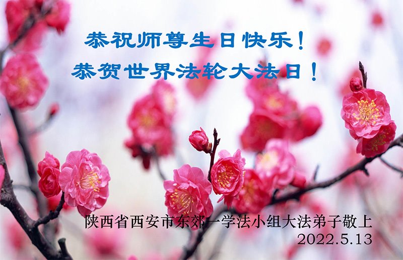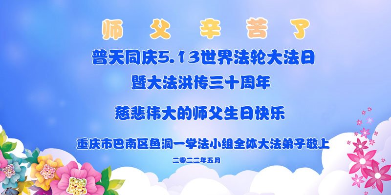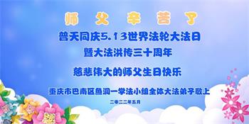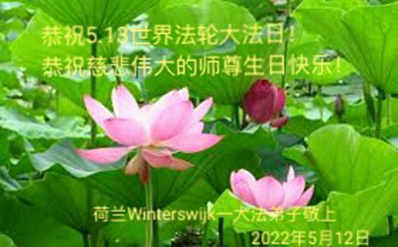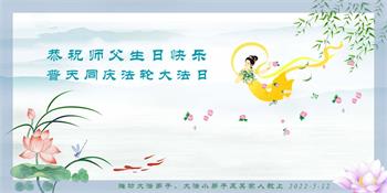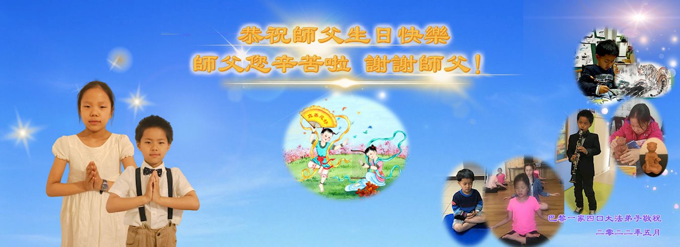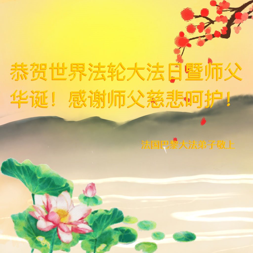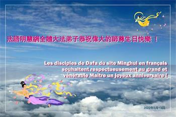伟大的正法走到今天,迎来了大法洪传三十周年。佛恩浩荡,乾坤再造,穹宇感念!在这伟大的历程中,师尊救度并造就了我们,也救度了无量穹体、无尽众生于坏灭,赐予了我们与众生未来的一切。弟子们与众生对师父、对大法无比感恩之心难以言表。值此二零二二年世界法轮大法圣日来临之际,法国大法弟子向慈悲伟大的师尊表达问候与感恩!恭贺大法洪传三十周年!恭祝师父生日快乐!