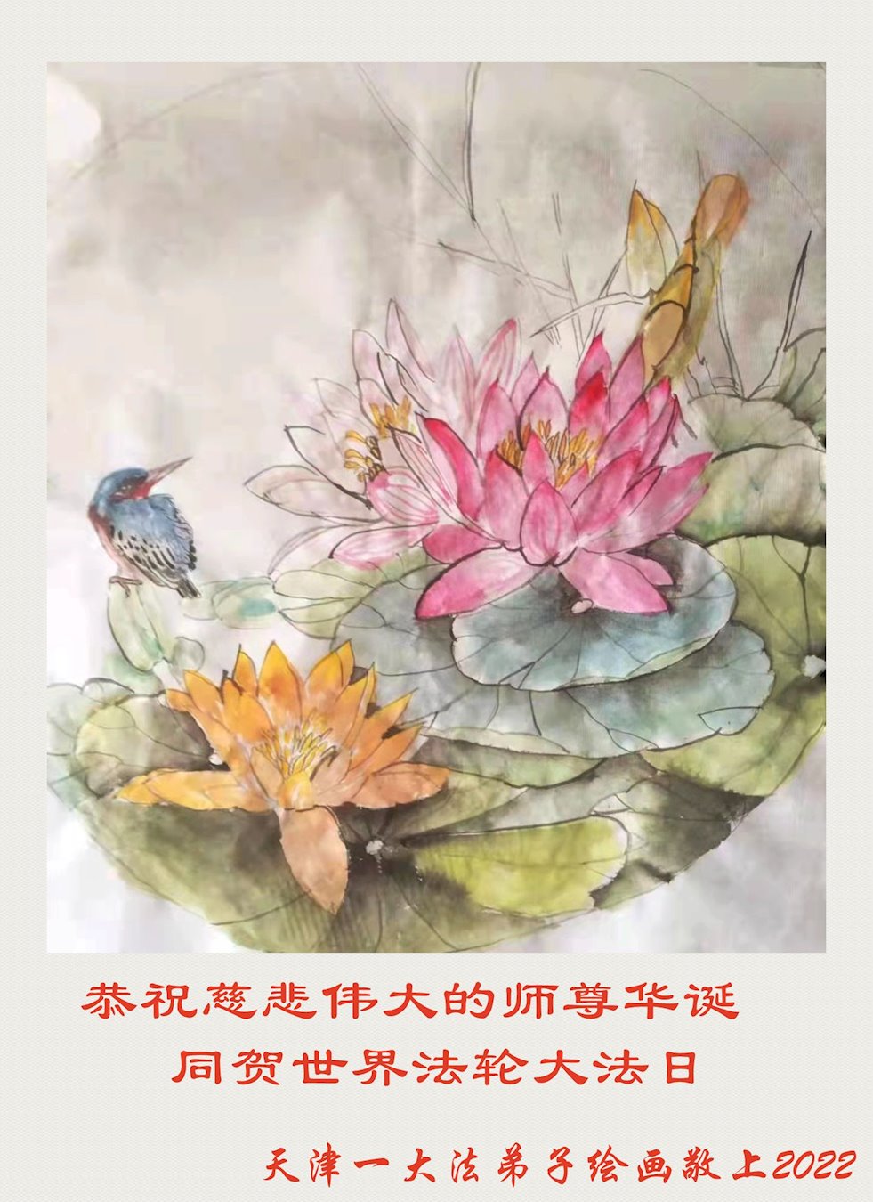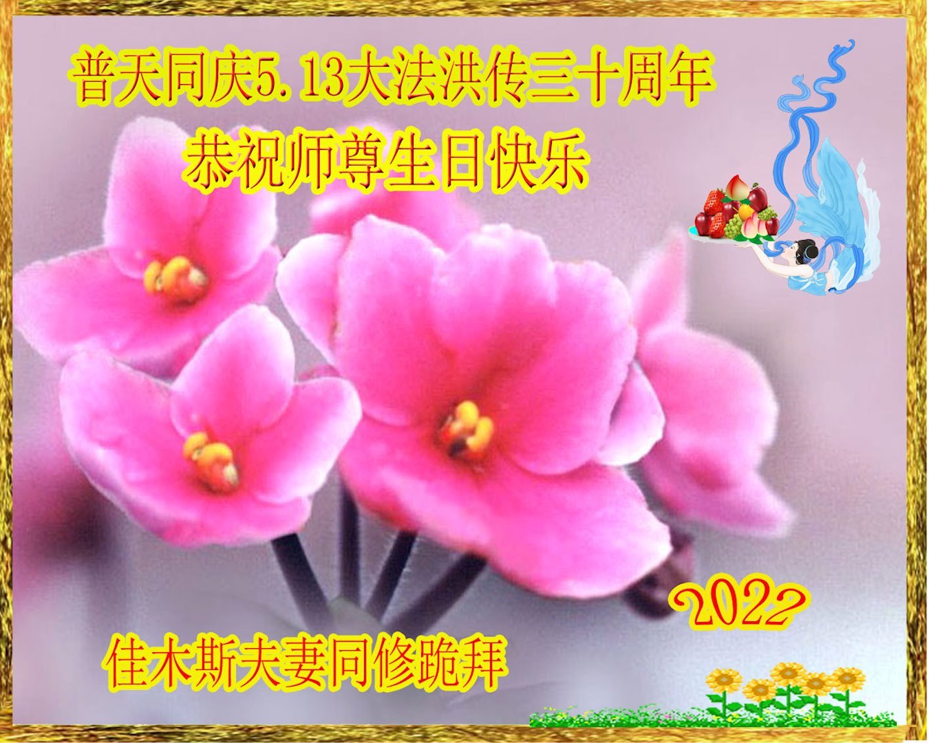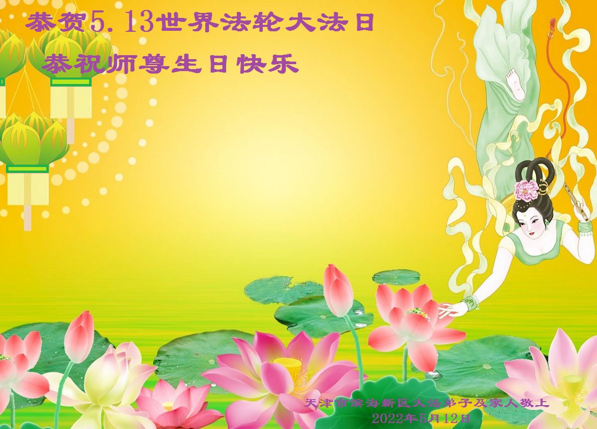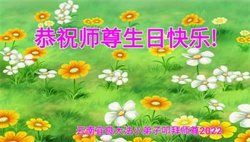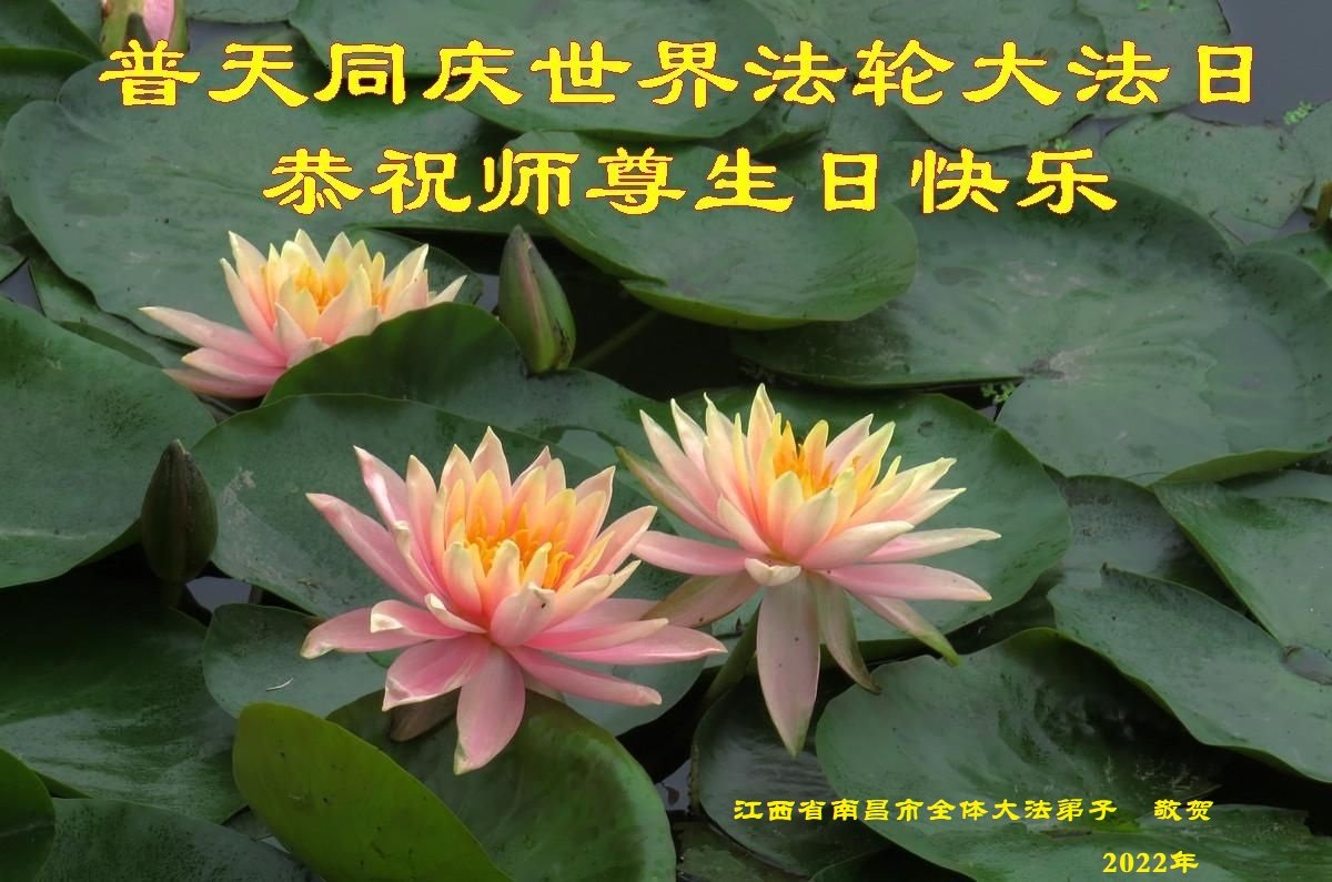 伟大的正法走到今天,迎来了大法洪传三十周年。佛恩浩荡,乾坤再造,穹宇感念!在这伟大的历程中,师尊救度并造就了我们,也救度了无量穹体、无尽众生于坏灭,赐予了我们与众生未来的一切。弟子们与众生对师父、对大法无比感恩之心难以言表。值此二零二二年世界法轮大法圣日来临之际,法国大法弟子向慈悲伟大的师尊表达问候与感恩!恭贺大法洪传三十周年!恭祝师父生日快乐!
