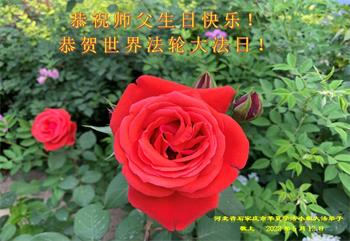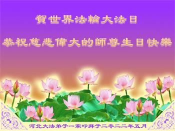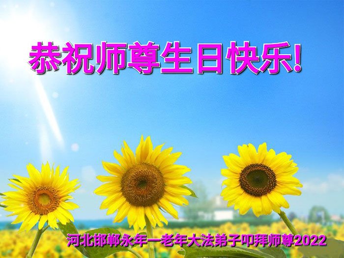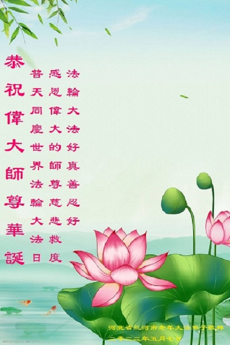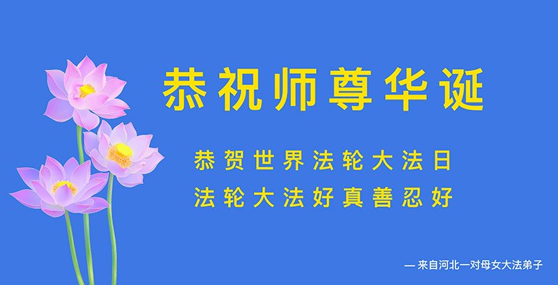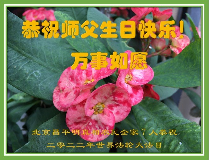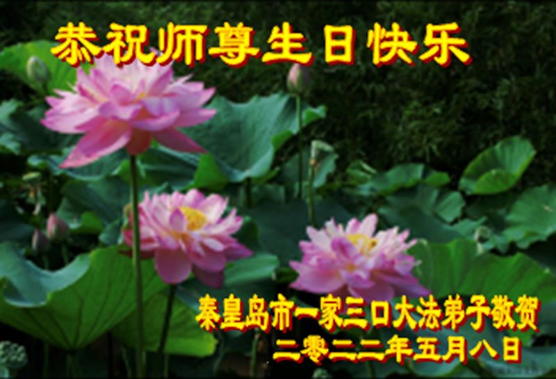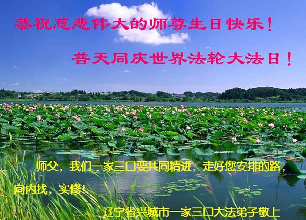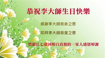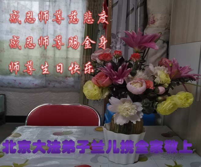 我天天供奉李大师,诚心念“法轮大法好”、“真善忍好”九字真言。每天端起饭碗来,我就会说:请李大师先吃!大法师父太慈悲了,我也不修炼,只爱看大法弟子发的真相资料,也只不过为蒙冤的法轮大法说句公道话,大师就把我和老伴的病治好了,是花多少钱都买不来的。李大师您辛苦了!我们全家人感谢李大师的救命之恩!恭祝李大师生日快乐!