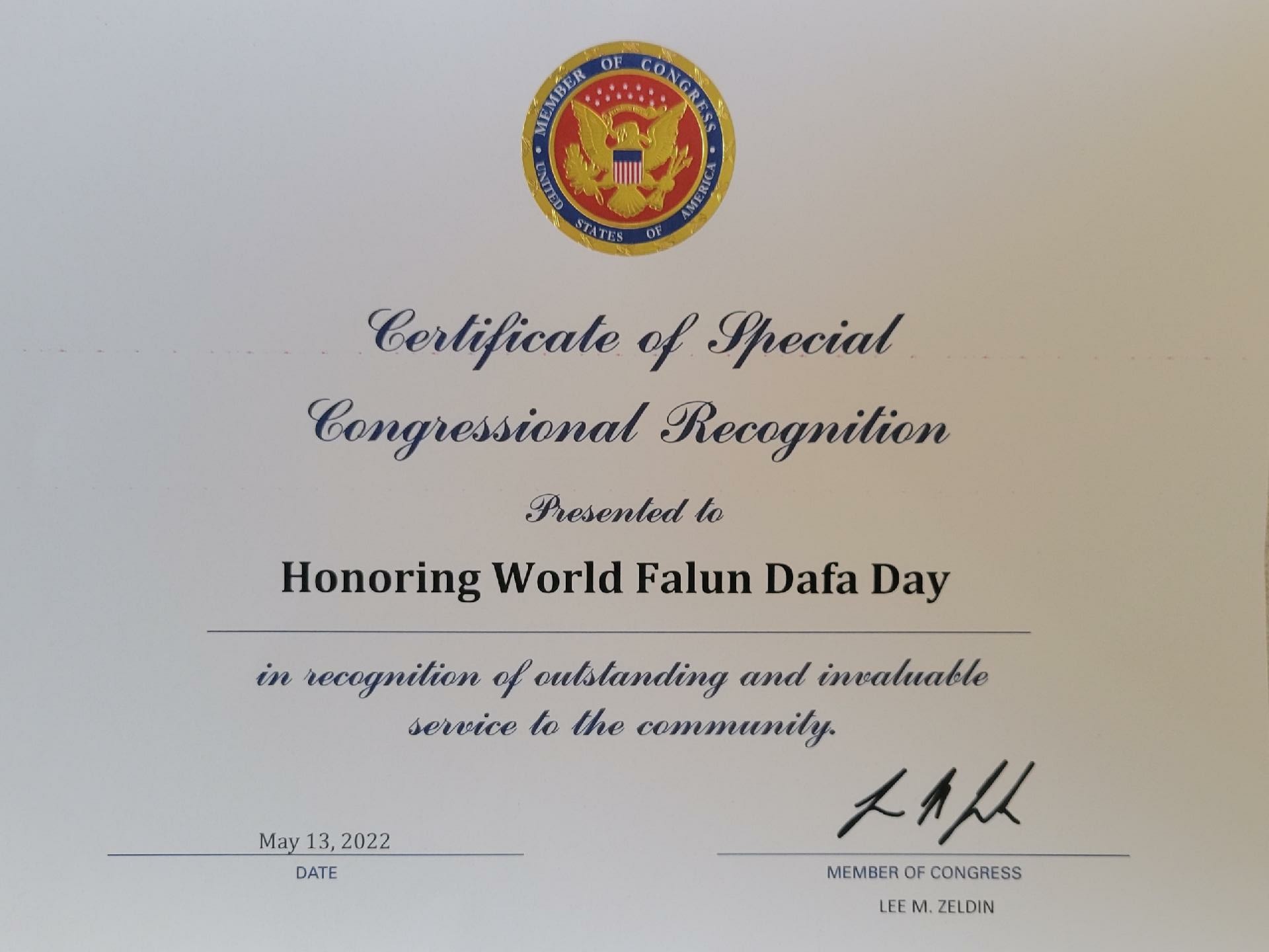 ![]() 图4:纽约州第一选区联邦众议员李·泽尔丁(Lee M. Zeldin)颁发美国国会特别褒奖令,“庆贺世界法轮大法日,表彰其对社区的杰出与无价的贡献”。 |