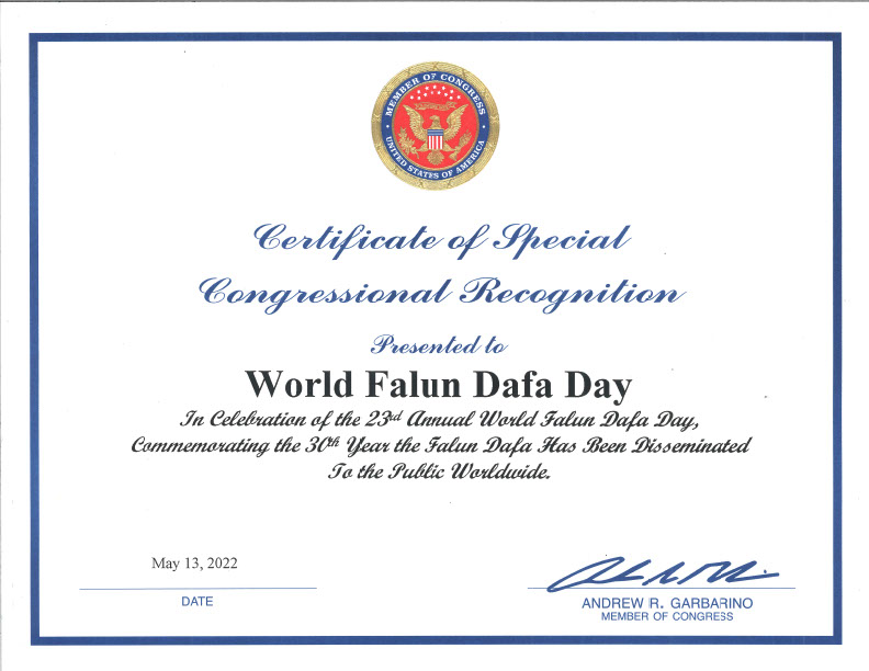 ![]() 图5:纽约州第二选区联邦众议员安德鲁·加巴里诺(Andrew Garbarino)颁发美国国会特别褒奖令,“庆贺第二十三届世界法轮大法日暨法轮大法洪传世界三十周年”。 |