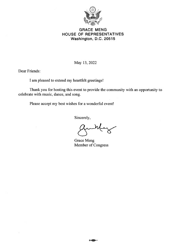 ![]() 图7:纽约州第六选区联邦众议员孟昭文(Grace Meng)在贺信中说,“我很高兴向你们表示衷心的问候。感谢你们举办这次活动,为社区提供了一个用音乐、舞蹈和歌曲来庆祝的机会。请接受我最良好的祝愿。” |