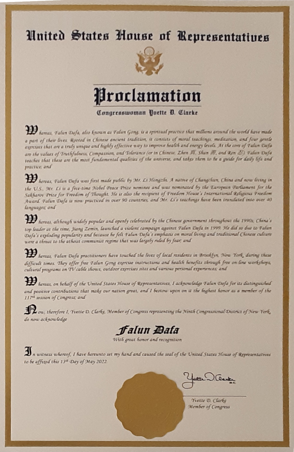 鉴此,我,Yvette D Clarke,谨代表众议院第九区,在此表彰法轮大法。